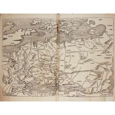 Nuremberg: Anton Koberger for Sebald Schreyer and Sebastian Kammermeister, 12th July 1493. Folio (456 x 309mm.), illustrated with over 1800 woodblock prints by Michael Wolgemut and Wilhelm Pleydenwurff, rebound in 18th or 19th century calf over ?original wooden boards, the binding worn; lacking 6 leaves including 1 Contents leaf ("El-Jula - Fredericus tercius"), folios 189, 259, 260 (259 & 260 mostly blank apart from page numeral and running title), 264 and 1 blank leaf at end, title-page trimmed and laid-down, 14 leaves with new lower margin and repaired in inner margin (folio 230 with some loss of woodcut), c. 17 additional leaves repaired in inner margin (folio 87 split with some loss of woodcut), c. 15 further leaves repaired in lower margin (folio 207 with tear extending into image, 226 verso affecting a few letters); folio 299 (map) repaired in inner margin and with corner supplied in manuscript facsimile; some light internal dampstaining and discolouration, a few minor wormholes not affecting text, neat repairs occasionally with slight loss to text, a few closed tears, a small amount of paint applied to a few images, folio 169 with one paragraph of text and image of a Pope erased by an early hand, some neat marginalia in an early hand, covers rubbed, joints split [USTC 748763; Goff S-307; HC *14508; Klebs 889.1; Oates 1026; Proctor 2084; BMC II, 437]