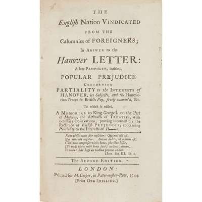 [Anon.] The English nation vindicated from the calumnies of foreigners; in answer to the Hanover letter: a late pamphlet, intitled, Popular Prejudice concerning Partiality. London: printed for M. Cooper, 1744. 8vo; 64 pp., "Second edition", [ESTC: 4 copies UK, 9 N. America]; [Anon.] Warning to the Whigs, and to the well-affected Tories. London: printed for J. Roberts, 1744. 8vo, collates: (2), 45 pp., [In this edition the ornament on the title-page consists of a face flanked by two cupids, and there are no press figure]; [Anon.] A private conference between two Hanoverian ministers at Hanover. London: printed for M. Cooper, 1744. 8vo, collates: (2), 24, (2), [ESTC: 7 copies]; [one pamphlet removed here]; [Anon.] The operations of the British, and the allied arms, during the campaigns of 1743 and 1744, historically deducted. London: printed for M. Cooper, 1744. First edition, 8vo, 54 pp., the variant with "Proceedings of the Army" as the drop-head title; [Anon.] Serious considerations on the present state of affairs, both at home and abroad... London: printed for C. Corbett, 1744. First and only edition, 8vo, 76 pp., with MS marginal notes in a contemporary hand, [ESTC: 16 copies]; [Anon.] The conduct of the Dutch explained and vindicated. In which the business of the Barrier... London: printed for Joseph Collyer, n.d. (1744). First edition in English, 8vo, collates: (4) 27 pp., half-title present, [ESTC 15 copies]; [one pamphlet removed here]; [Anon.] A letter to His Prussian Majesty, upon his most extraordinary breach of publick and solemn faith.. at the Castle of Klein Schnellendorf, the 9th of October, 1742. London: printed for the author, 1744. First and only edition, 8vo, collates: (2), 21 pp + a final leaf of advertisements, half-title present (some dust-soiling), [ESTC: 11 copies]; [Anon.] Natural reflexions on the present conduct of His Prussian Majesty. London: printed for M. Cooper, 1744. First edition, 8vo, collates: (2), 56 pp., [ESTC: 17 copies]; [Great Britain. Parliament. House of Lords] The Lords protest on a motion to address His Majesty, to exonerate his subjects of the charge and burthen of those foreign troops. London: printed in the year 1742. 8vo; 14 pp., half-title present, [ESTC lists only a 30-page edition ("printed for T. Webster"), with additional text]; [Great Britain. Parliament. House of Lords] The Lords protest against an act for repealing certain duties upon spiritous liquors. London: printed in the year 1743. First and only edition, 8vo; 12 pp., wanting the half-title, [ESTC: 5 copies; Kress 4661]; [Great Britain. Parliament. House of Lords] The lords protests. To which is added, a list of the members of Parliament who voted for and against continuing the Hanover troops in British pay, Jan. 18, 1743. London: printed for W. Weaver, 1744. First and only edition, 8vo, collates: 14, (4), 154-27 pp. + a folding table, [ESTC: 11 copies]; contemporary half calf, labelled 'Miscellanies', numbered 95 on spine, worn, bookplate of Sir William Forbes, Bart of Pitsligo;