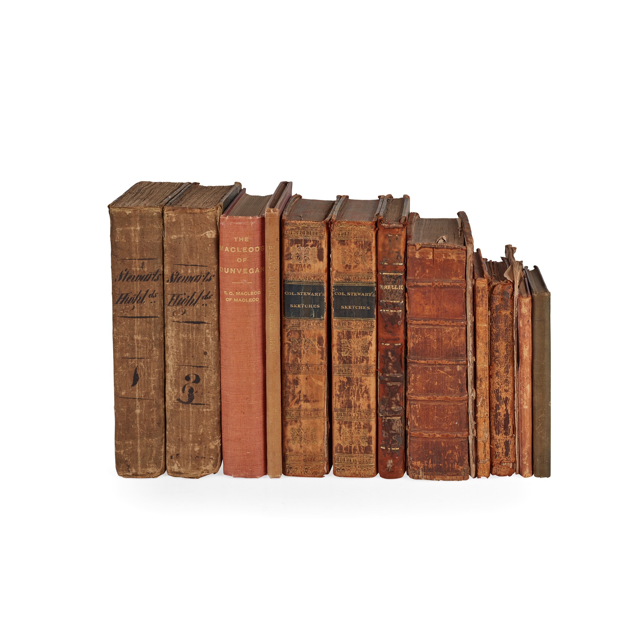 The Scots Magazine...Volume VIII. Edinburgh: W. Sands, A. Murray, and J. Cochran, [1746]. 8vo, contemporary calf, upper cover detached; Stewart, David Sketches of the Character, Manners and Present State of the Highlanders of Scotland. Edinburgh: Archibald Constable & Co., 1822. 2 volumes, 8vo, hand-coloured folding map with some repairs, contemporary boards with later cloth spines; [Idem] Sketches of the Character, Manners and Present State of the Highlanders of Scotland. Edinburgh: Archibald Constable & Co., 1822. 2 volumes, 8vo, hand-coloured folding map, contemporary half calf, annotations to flyleaf in an early hand; The History of the Rise, Progress, and Extinction of the Rebellion in Scotland in the Years 1745 and 1746. London: R. Thomson et. al., [n.d.] Second edition, 8vo, frontispiece, portrait, contemporary half calf, ownership inscription of Emily Forbes; Bacon, Sir Francis The Compleat Parish-Officer...to which is added the Office of Constables. The Savoy: Bernard Lintot, 1734. Seventh edition, 12mo, contemporary calf, covers very worn, a large amount of internal marking; Munro, James A Gaelic Primer containing Rules for Pronouncing the Language. Glasgow: John Wylie & Co., 1828. 12mo, contemporary calf, hole to front free-endpaper; History of the Siege of Blair Castle in 1746. Privately printed, 1874. 8vo, inscribed to Duncan Forbes of Culloden from the Duke of Atholl, 1882; Description of the Regalia of Scotland. Edinburgh: James Ballantyne and Company, 1819. 12mo, lacking covers; MacLeod, R.C. The MacLeods of Dunvegan. The Clan MacLeod Society, 1927. 8vo, original red cloth gilt, signed by the author; Beresford, M. Standing Orders of the Seventy-Second Highlanders. Peshawar, 1873. 12mo, contemporary red calf; A History and Description of the Town of Inverness... Inverness: Kenneth Douglas, James Smith and Donald Fraser, 1847. 12mo, original green cloth gilt; sold not subject to return (13)