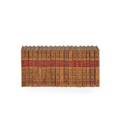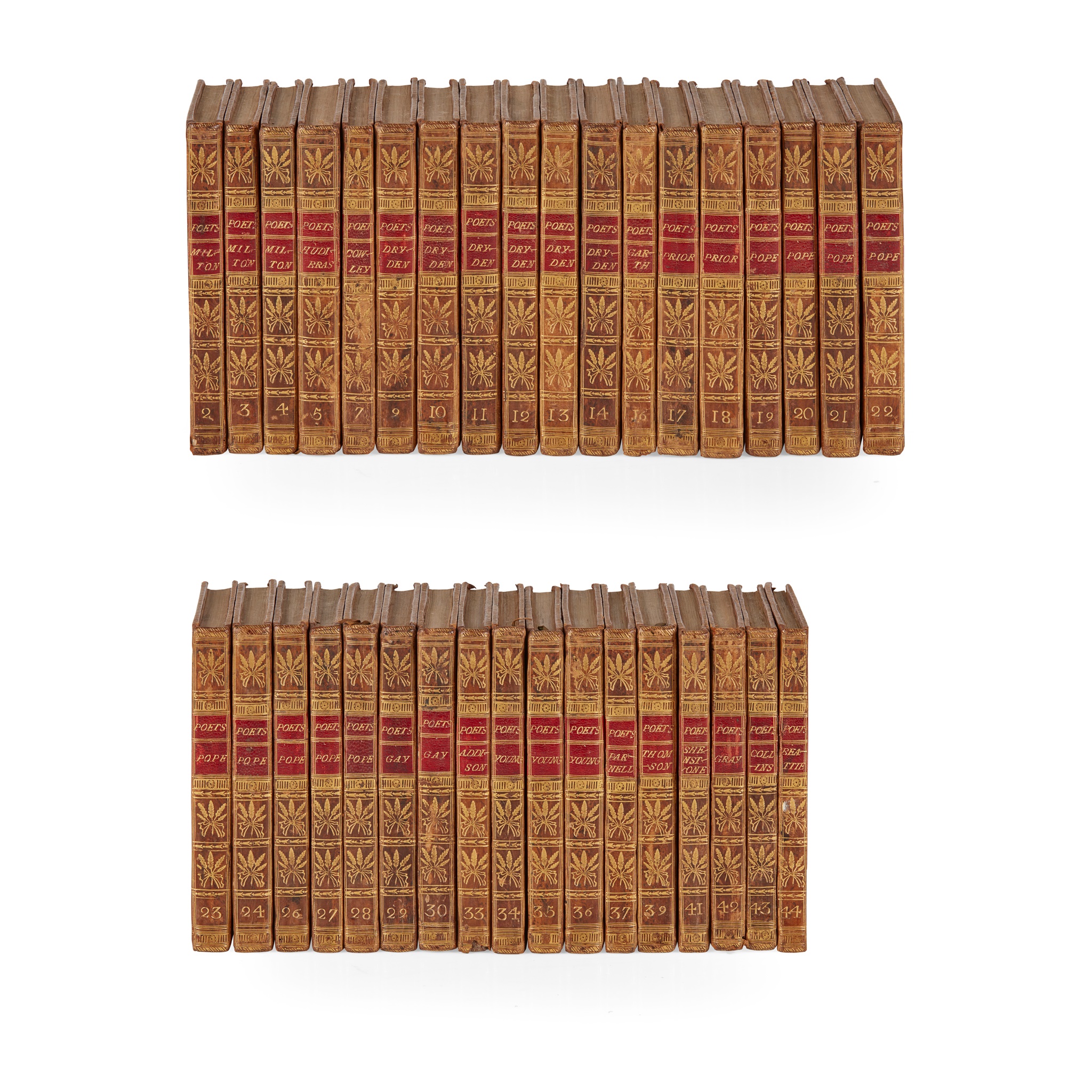 Edinburgh: A. Kincaid and W. Creech, 1773-1776. 35 (of 44) volumes only, comprising volumes 2-5, 7, 9-14, 16-24, 26-30, 33-37, 39 & 41-44, in uniform tree calf with red morocco gilt labels and gilt tooling to spines, upper left corners of initial leaves in 'Paradise Lost' volume ii torn with loss to 'P', occasional slight worming to margins and joints (35)
