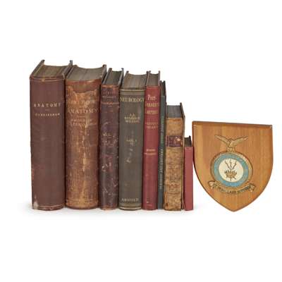 Wilson, S.A. Kinnier. Neurology, edited by A. Ninian Bruce. 1940, 2 volumes, 8vo, presentation copy to Edwin Bramwell, son of Byron Bramwell, from the editor, with his letter tipped in at beginning, signature and bookplate of Edwin Bramwell, [the book is dedicated to the memory of Sir Byrom Bramwell and Dr. A. Bruce]; and 2 non-medical books that belonged to Byrom Bramwell as a child (Prescott, History of Philip the Second; Burbridge. Manual of Holy Communion) and a wooden and metal shield emblazoned Second Allied Tactical Air Force, with note on back to W.G CDR E.C.B. Bramwell with best wishes from all HQ TWOTATAF OFFICERS