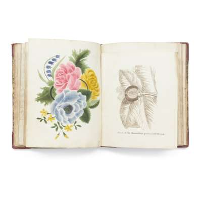 3) Commonplace book of Eliza Quekett (1812-1875), c.1825-30, approx. 90 ff., calligraphic ownership inscription 'Eliza Quekett' to first page, manuscript quatrain signed 'Eliza' to front free endpaper, containing poetry transcriptions (including Thomas Moore, 'On leaving Langport'), 12 laid-in plant specimens, one botanical watercolour, one pen-and-ink drawing captioned 'Fruit of the Mangosteen produced at Sion house', and mounted silhouettes, contemporary red half roan album, 19.6 x 15.5cm;