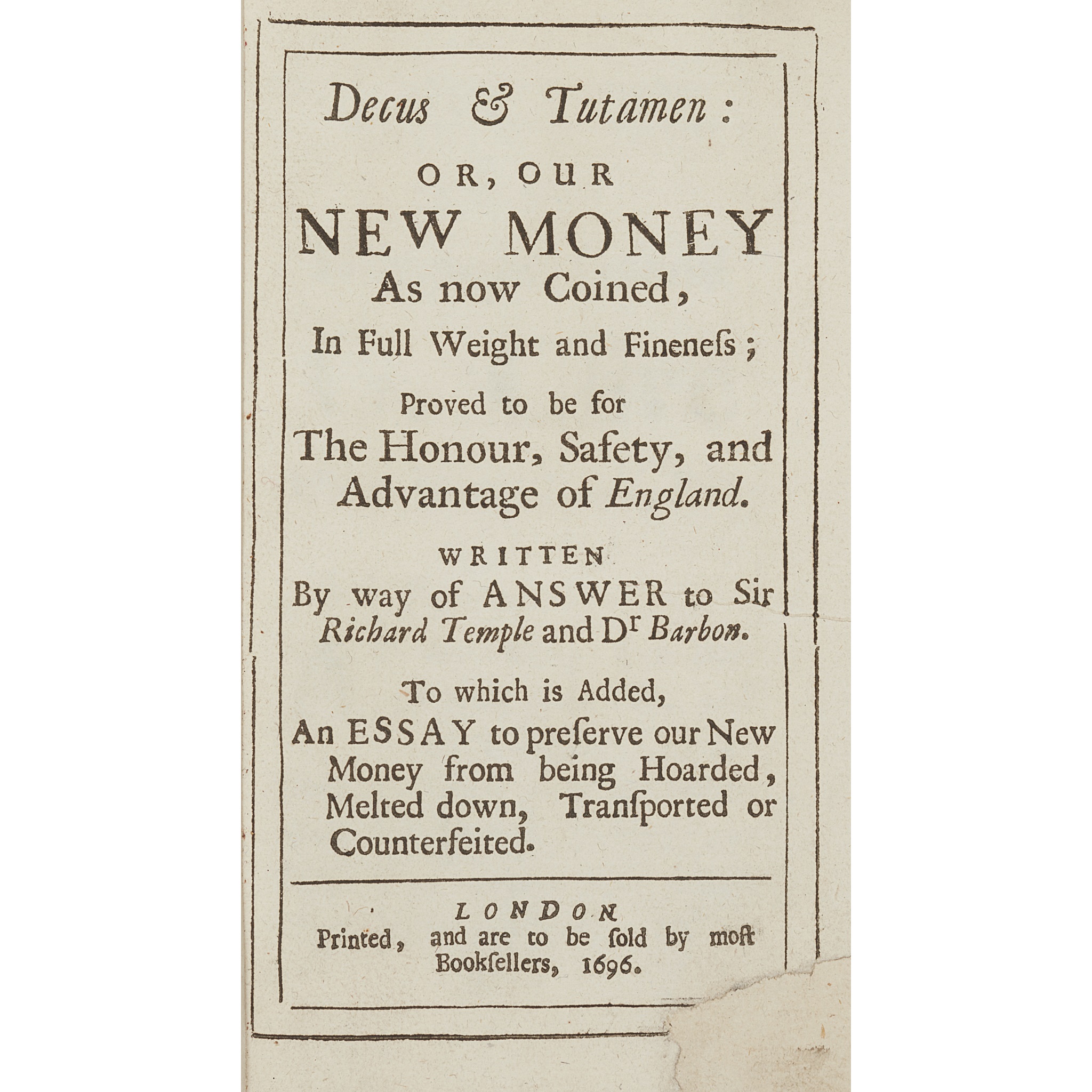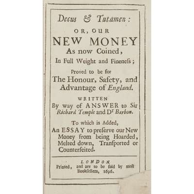 in Full Weight and Fineness... to which is added, an Essay to preserve our New Money from being Hoarded, Melted down, Transported or Counterfeited. London: [no publisher] Printed and are to be sold by most booksellers, 1696. First edition, 12mo, [viii]. 64; early 19th century half calf, head of spine worn, joints splitting, lower corner of title torn away and replaced (no loss of text), stamp and bookplate to front endpapers of The Institute of Bankers in Scotland, upper hinges slightly weak, [ESTC R23358, 7 copies UK, 6 N. America]