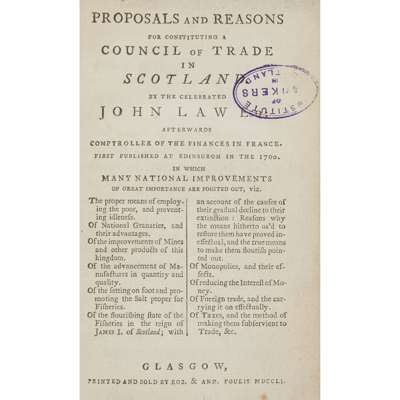 [Paterson, William]. Proposals and Reasons for Constituting a Council of Trade in Scotland by the celebrated John Law Esq. Glasgow: R. & A. Foulis, 1751. 12mo, [xx], 282, [1pp. adverts], stamp on title page and bookplate of The Institute of Bankers in Scotland, also with armorial bookplate of Sir John Paterson of Eccles Bart., contemporary calf, rubbed [ESTC T97288 - 21 copies British Isles, 31 N. America];