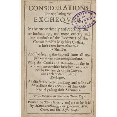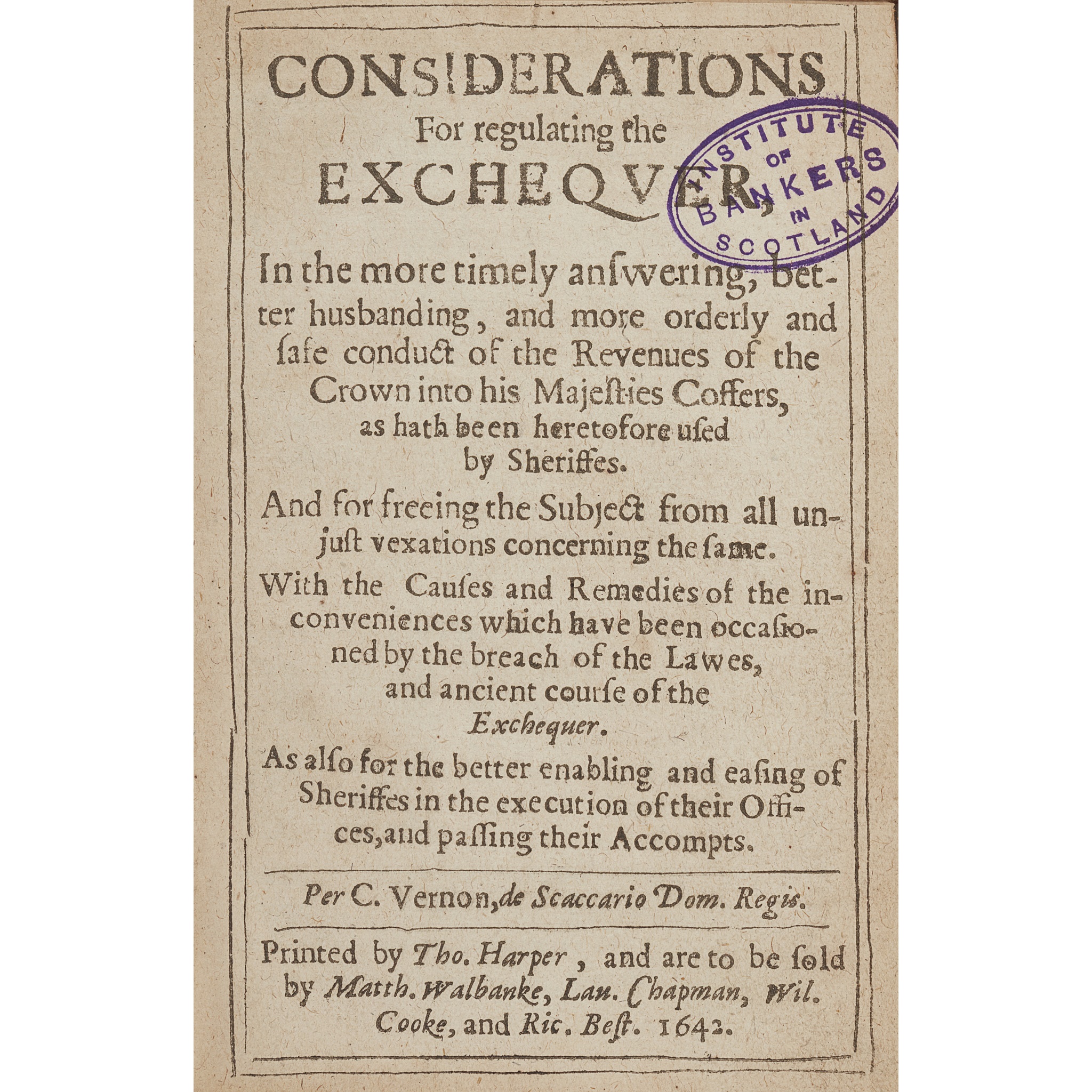 in the more timely answering, better husbanding, and more orderly and safe conduct of the Revenues of the Crown into his Majesties Coffers, as hath been heretofore used by Sheriffes. London: Thomas Harper, to be sold by Matth. Walbanke, Lau. Chapman, Wil. Cooke and Ric. Best, 1642. First edition, 12mo, [viii], 118, [ii], errata leaf at end laid down with loss of corners (no loss of text), late 18th or early 19th century calf, library stamp on title and bookplate on endpaper of the Institute of Bankers in Scotland, rubbed, upper cover detached, early ownership inscription 'John Dunston' on verso of title, a few early annotations in the margin [ESTC R5970, 21 copies UK, 12 N. America, 1 France, 1 Australia]