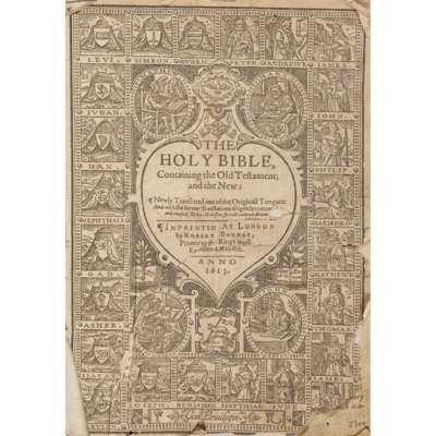 London: Robert Barker, 1613 [i.e. 1614]. 4to (21.2 x 15cm), contemporary panelled sheep, signatures [superscript pi]A8 A-4S8, retaining both the general and New Testament title-pages (each with woodcut border), various ownership inscriptions including 'The Bible of Mr Robt Abraham June the 24 1746' (i.e. the year after the Forty-Five), variable browning and staining, general title-page frayed and with old repairs, New Testament title (3E3) torn with partial loss of woodcut border, worming to foot of quires A-P occasionally touching bottom line of text, tears with loss in D3, 2F7, 3B5, Concordances (1615) and Psalms (1618, defective) bound in at rear [Darlow & Moule (1968 ed.) 331]