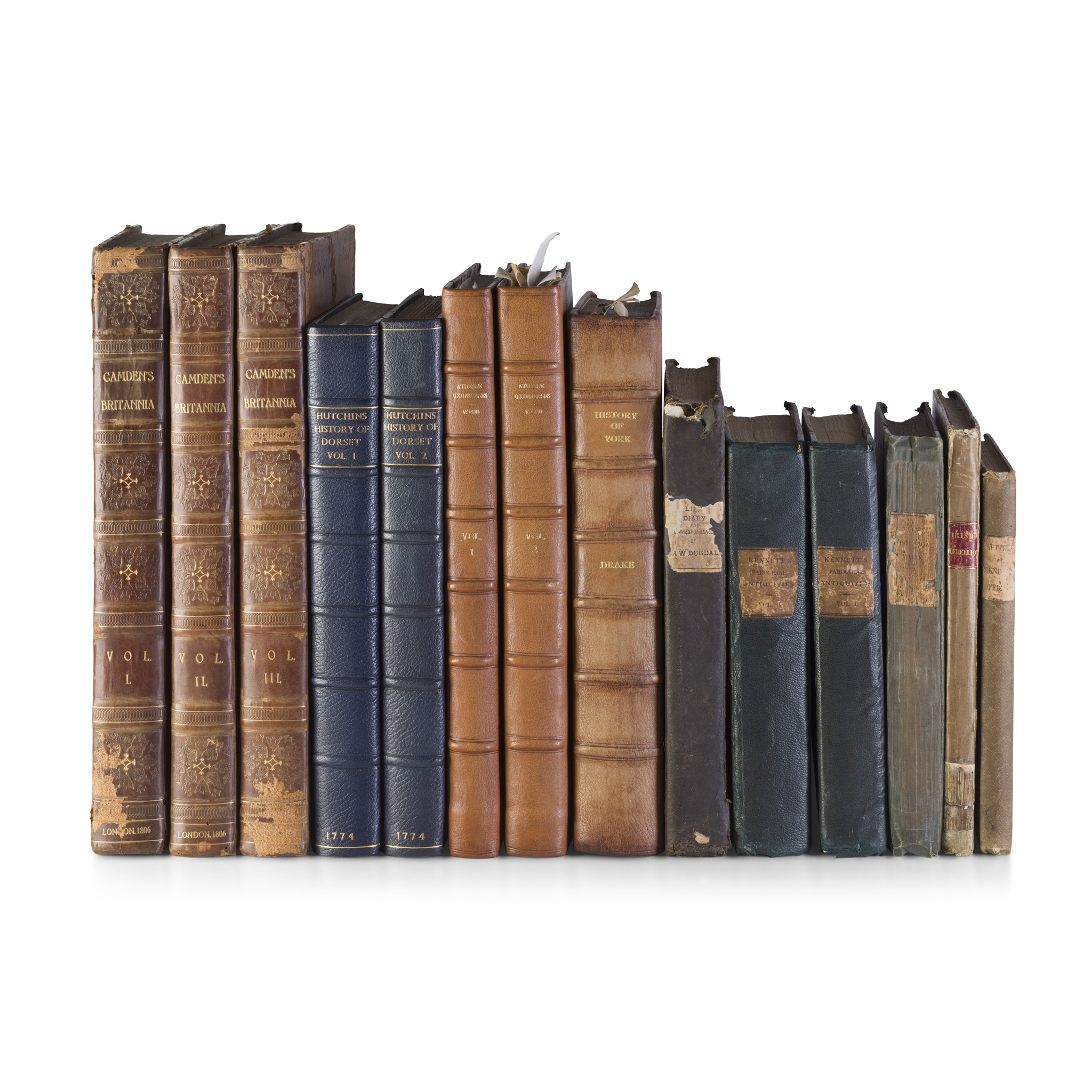 Hutchins, John. The History and Antiquities of the County of Dorset. London: W. Bowyer and J. Nichols, 1774. First edition, 2 volumes, folio (37 x 24cm), modern blue half morocco, engravings in text (including the Cerne Abbas giant, vol. 2 p. 293), folding tables, bound without the plates and map, damp-staining [ESTC T99476];