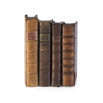 The First Part ... a Commentary upon Littleton; The Second Part ... Containing the Exposition of Many Ancient, and Other Statutes; The Third Part ... Concerning High Treason, and Other Pleas of the Crown, and Criminall Causes; The Fourth Part ... Concerning the Jurisdiciton of Courts. London: [various printers], 1684-42-44-69. 4 works in 3 volumes (Third Part and Fourth Part bound in one), ninth, first, first and fourth editions, folio, First Part in 18th-century calf gilt, gilt supralibros incorporating baron's coronet to each cover, frontispiece discarded, retaining engraved portrait of Littleton and folding woodcut table of consanguinity, binding worn, text not collated, Second Part in contemporary sheep, decorative woodcut border to title-page, retaining colophon leaf, chip to head of front joint, T2-3 transposed, no frontispiece called for by ESTC, Third-Fourth Part in contemporary blind-ruled calf (recornered), Third Part with decorative woodcut border to title-page and [16 pp.] index not mentioned in ESTC, engraved portrait frontispiece by R. White (the portrait noted as signed 'I Payne fecit' by ESTC, the example in this copy apparently moved from the Fourth Part where no portrait called for but here offset onto A4 v.) [ESTC R473, R12887, R12841, R35651; Wing C4928, C4948, C4960, C4931];