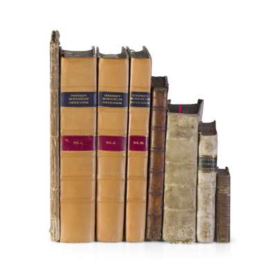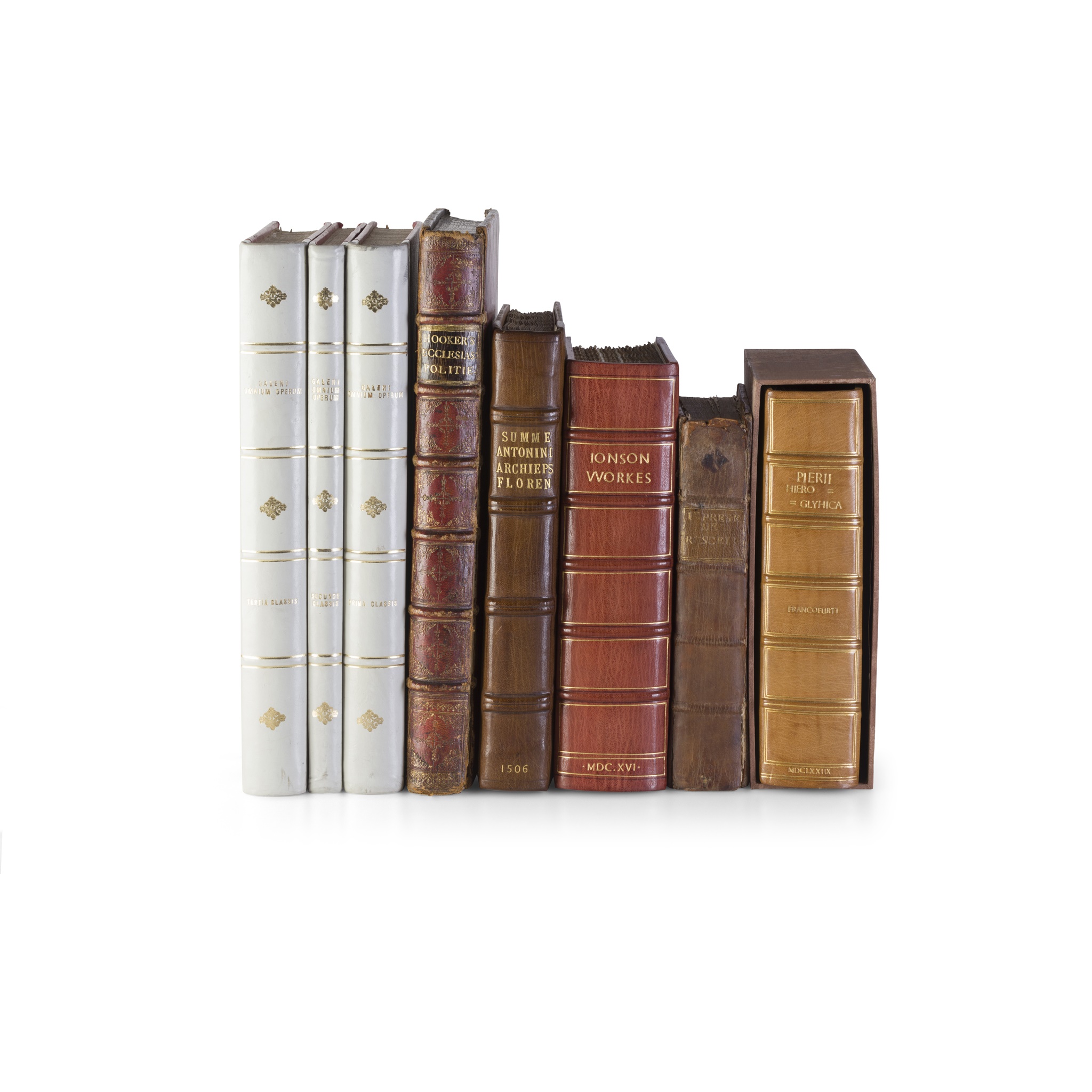 and 8 others (these not collated), including: Dugdale, Monasticon Anglicanum, 1655-61-73 (3 volumes, folio, modern calf, engraved plates); Silius Italicus, De bello Punico, Lyon, 1547 (16mo, later binding); Giovanni Pietro Valeriano Bolzani, Hieorglyphica, Frankfurt, 1678 (4to, modern tan morocco gilt); Tacitus, Opere, Venice: Giunti, 1620 (4to, contemporary vellum, engraved additional title-page, front inner hinge gone); Galen, Omnium operum, Venice: Valgrisi, 1562 (3 volumes only, of 10, folio, modern bindings, repairs); Ben Jonson, Workes, 1616 (first collected edition, volume one only, folio, modern orange morocco, numerous leaves including title-page supplied in photocopy); Biondi, An History of the Civill Warres of England, betweene the two Houses of Lancaster and Yorke, 1641 (lacking engraved title-page); and similar (16)