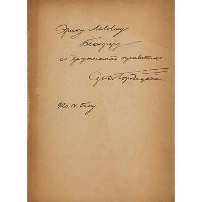 Tiflis [Tbilisi]: [no publisher], 1918. 8vo, 32 pp. (17.7 x 13.5cm), wire-stitched, head- and tailpieces from bas-reliefs in the Akdamar monastery (Lake Van, modern Turkey), inscribed by the author in Russian on dedication leaf recto 'Erik Lvovich Bekoder[?] s druzhecki privetlivy, Sergey Gorodetsky, [1]920 IV Baku' ('To Erik Lvovich Bekoder[?], with friendliest greetings, Sergei Gorodetsky, 1920 IV Baku'), disbound, browned, together with 11 others, Russian literature, including Boris Pasternak, Doktor Zhivago, Milan: Feltrinelli, 1957 [i.e. 1958] (first trade edition in Russian, original light green boards, later-issue dust jacket), Leon Trotzky, The Bolsheviki and World Peace, New York: Boni and Liveright, 1918 (original blue-green cloth, portrait frontispiece) (12)