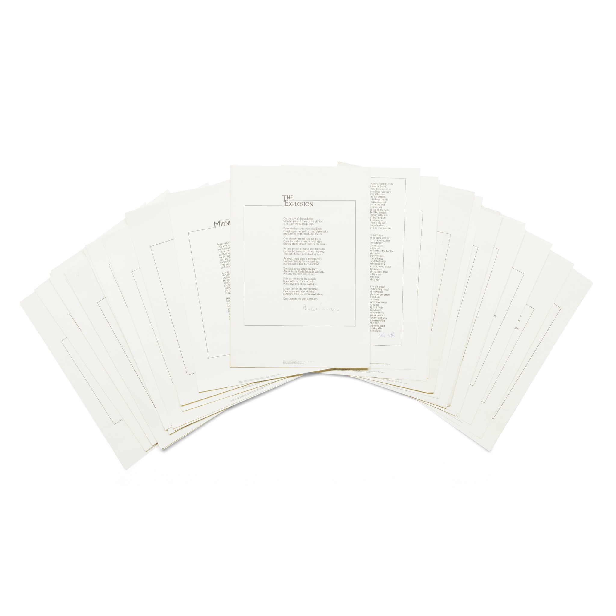 including: Philip Larkin, The Explosion (2 copies); W. H. Auden, Natural Linguistics (2 copies); John Betjeman, A Wembley Lad and The Crem (2 copies, each with autograph correction); Stephen Spender, Art Student (3 copies); Thom Gunn, Last Days at Teddington (4 copies); Stevie Smith, Francesca in Winter; Robert Graves, Advice from a Mother; and other authors (Roy Fuller, Anthony Thwaite, John Fuller, Elizabeth Jennings, George Baker, Norman MacCaig, Peter Porter, Douglas Dunn, D. J. Enright, John Lehmann, Alan Brownjohn, Glyn Hughes, Alan Ross, Ian Hamilton, Gavin Ewart, Julian Symons, Norman Nicholson, Molly Holden, Philip Oakes, Harold Massingham, Ruthven Todd, Cecil Day-Lewis) (1 folder)