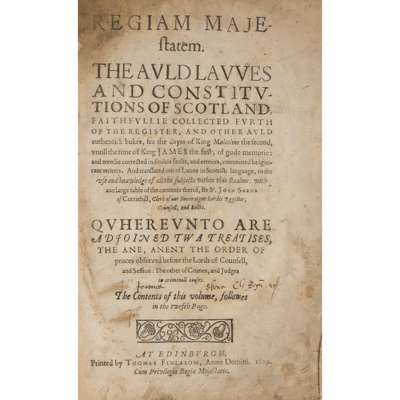 Faithfullie collected furth of the Register, and Other Auld Authentick Bukes ... be [sic] Sr John Skene. Edinburgh: Thomas Finlason, 1609. Folio (27.4 x 17.2cm), contemporary sprinkled calf, P2 [f. 84] misnumbered 85, P3 [f.85] missigned P, retaining medial blank 2D6 and final blank 2H4, woodcut head- and tail-pieces and initials, author's name added to title-page in a contemporary hand, spine worn, damp-staining towards front and rear [ESTC S117424; STC 22626]