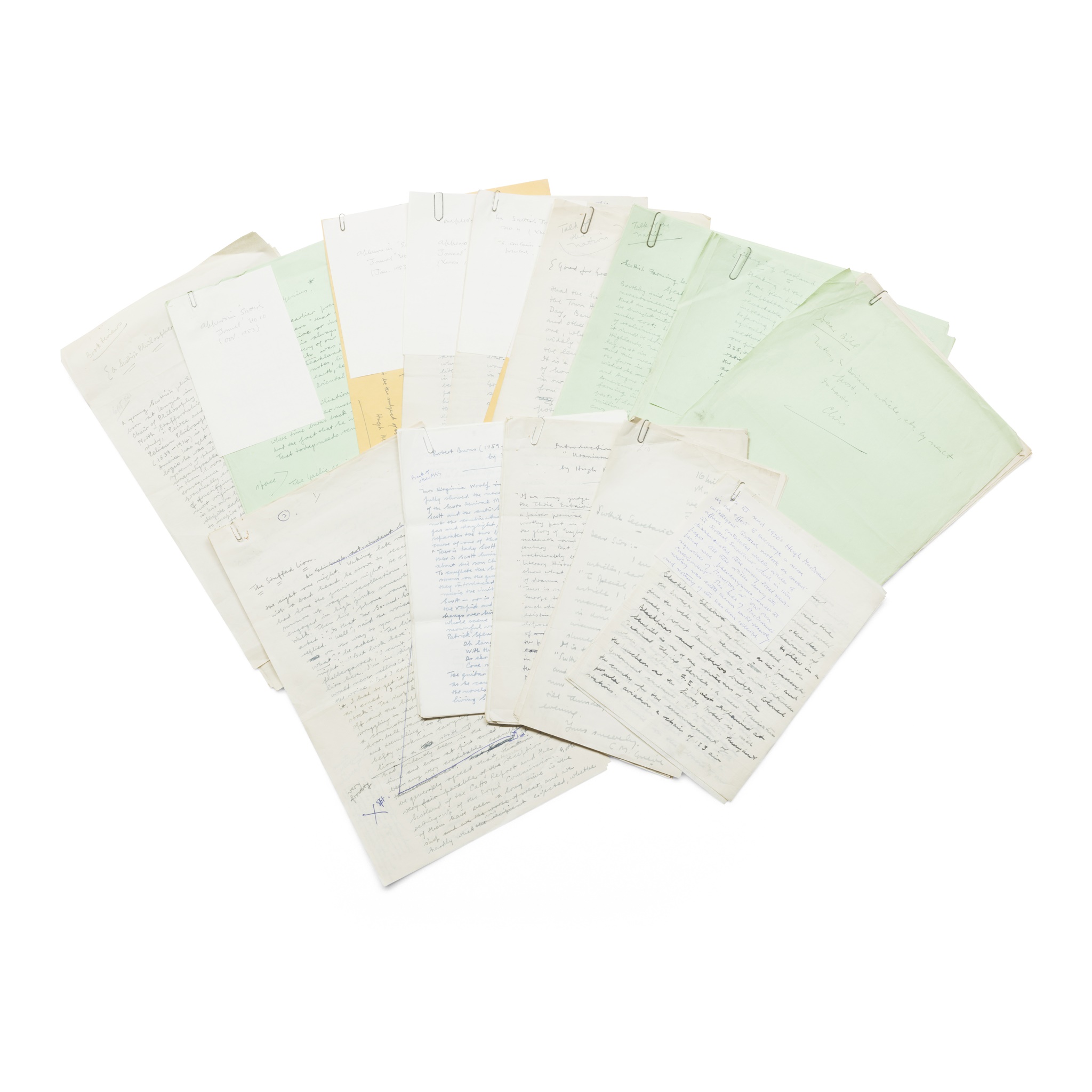 1) 'Robert Burns (1759-1959)', 20 ff., signed 'Hugh MacDiarmid' in title, begins 'Mrs Virginia Woolf in her essay "Gas at Abbotsford" fully showed the necessity and complete justification of the Scots Revival Movement', apparently a fair copy, published as Burns Today and Tomorrow (Edinburgh, 1959);