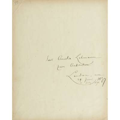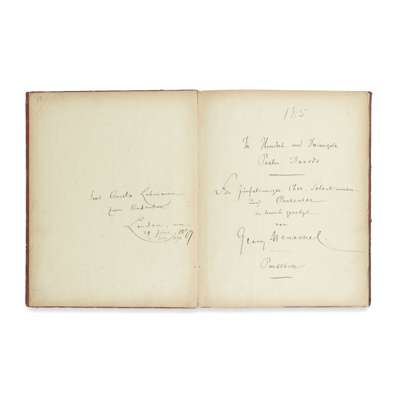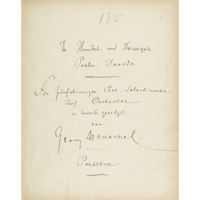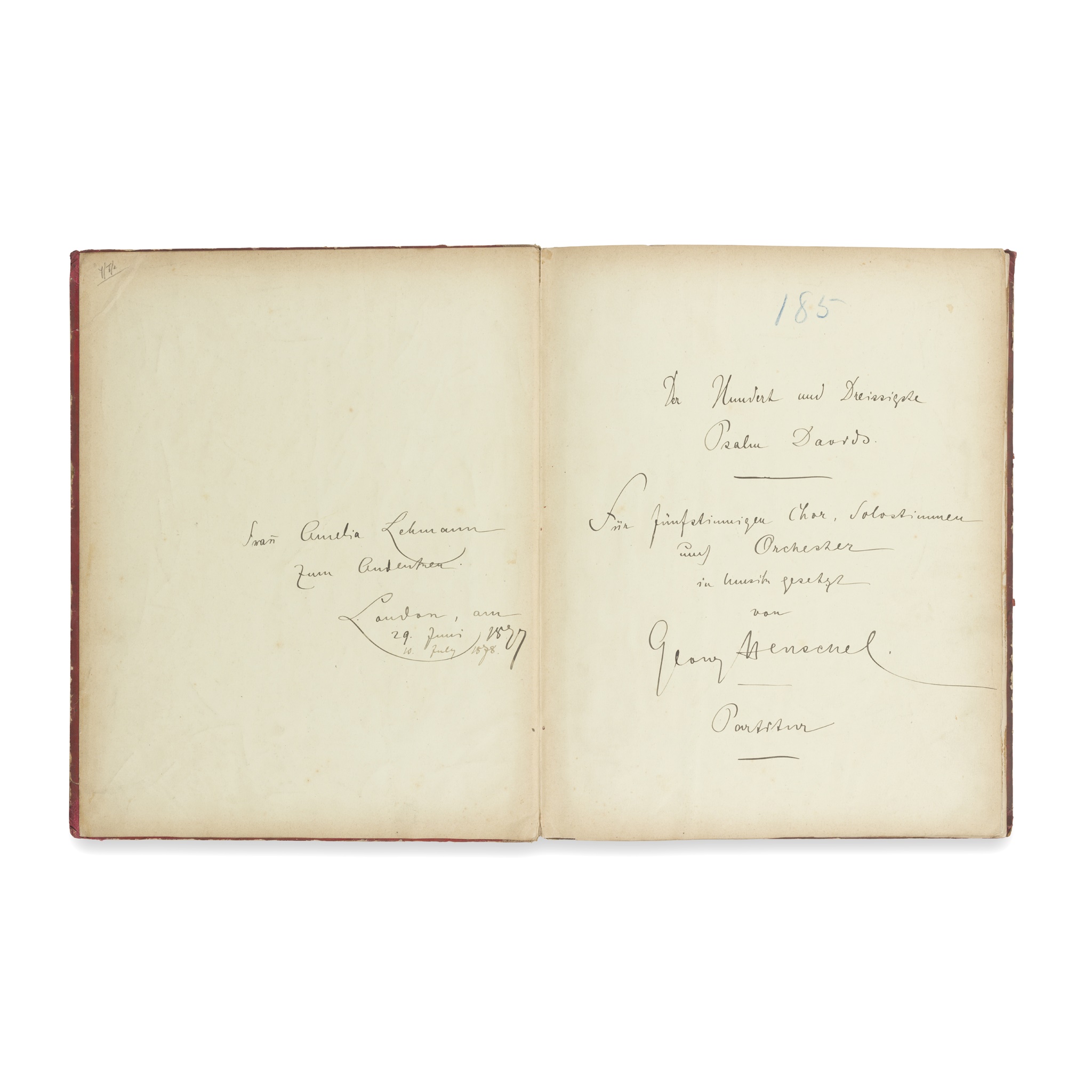 Henschel, Sir Isidore Georg (1850-1934). [Psalm CXXX for five-part chorus, solo voices and orchestra], c.1878. 97 pp., probably secretarial, with Henschel's autograph title and presentation inscription, 'Der Hundert und Dreissigste Psalm Davids, für fünfstimmigen Chor, Solostimmen und Orchester ... gesetzt von Georg Henschel. Frau Amelia Lehmann, zum Andenken, London am 29 Juni 1877, 10. July [sic] 1878' to front free endpaper and pastedown, 33 x 26cm, contemporary quarter cloth binding;