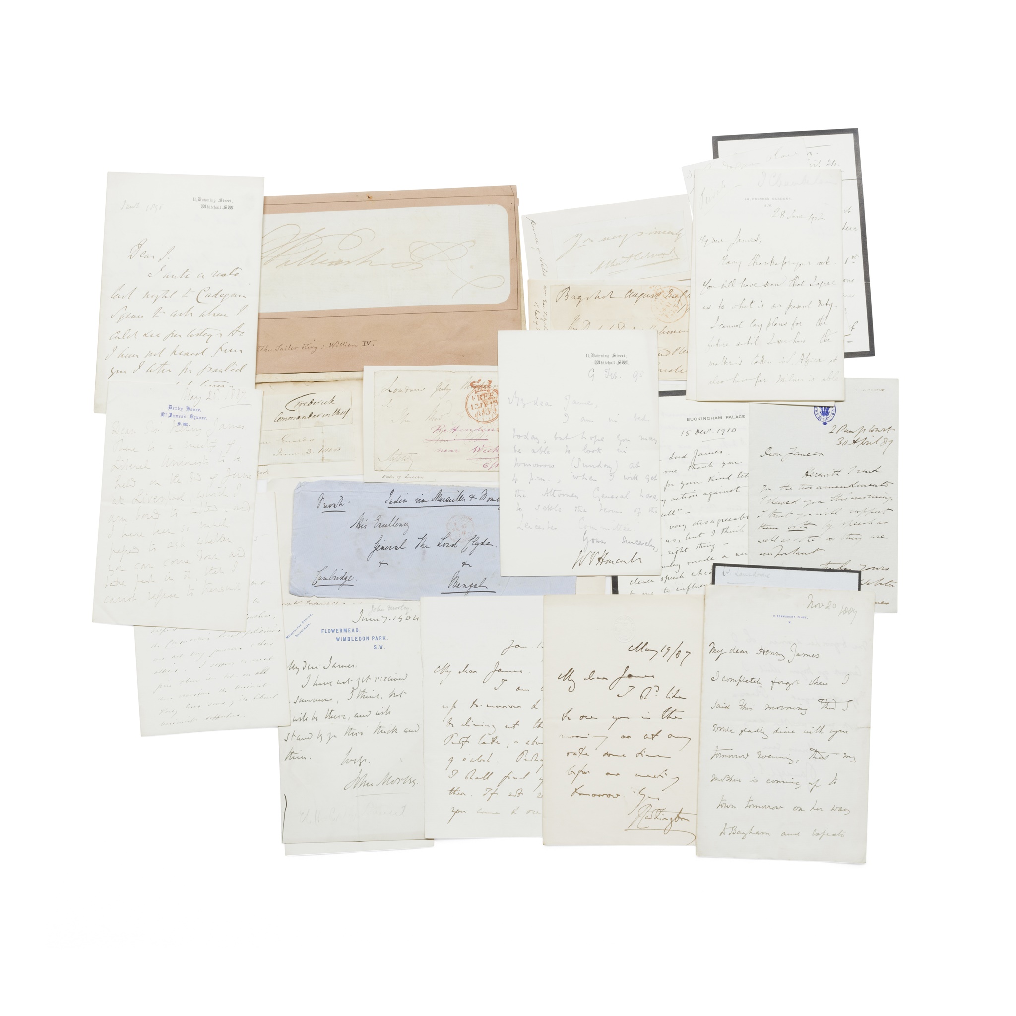 Together with approx. 25 similar autograph letters signed from peers and politicians, including John Bright (1811-1880), 1872 ('I shall be happy to present your petition to the house'), Sir Stafford Northcote (1818-1887), 1866, Roundell Palmer, 1st Earl of Selborne, 1887, to the Marquess of Hartington ('I will certainly ... attend the Unionist conference ... After the line taken by Gladstone, (which seems to one to get worse with every new speech or letter), it is certainly of great importance'), William Cavendish, 7th Duke of Devonshire (1808-1891), 2 letters, 1864 and 1876, on Windsor Castle and Chatsworth stationery respectively, John Campbell, 9th Duke of Argyll (1845-1914), 1910, on Inveraray stationery ('My publishers are Alex. Strahan Co. 56 Ludgate Hill'), and others; and approx. 80 clipped signatures and signed envelopes, including John Dillon (1851-1927), Irish nationalist, George Eden, 1st Earl of Auckland (1784-1849), George Canning, 1st Earl Canning (1812-1862), Robert Lowe (1811-1892), chancellor of the exchequer, and numerous others (e.g. Bedford, Clarendon, Bessborough, Norfolk, Spencer, Egremont, Beaufort, Newcastle, Annesley, Westminster, etc.) (approx. 150 pieces in 1 folder)