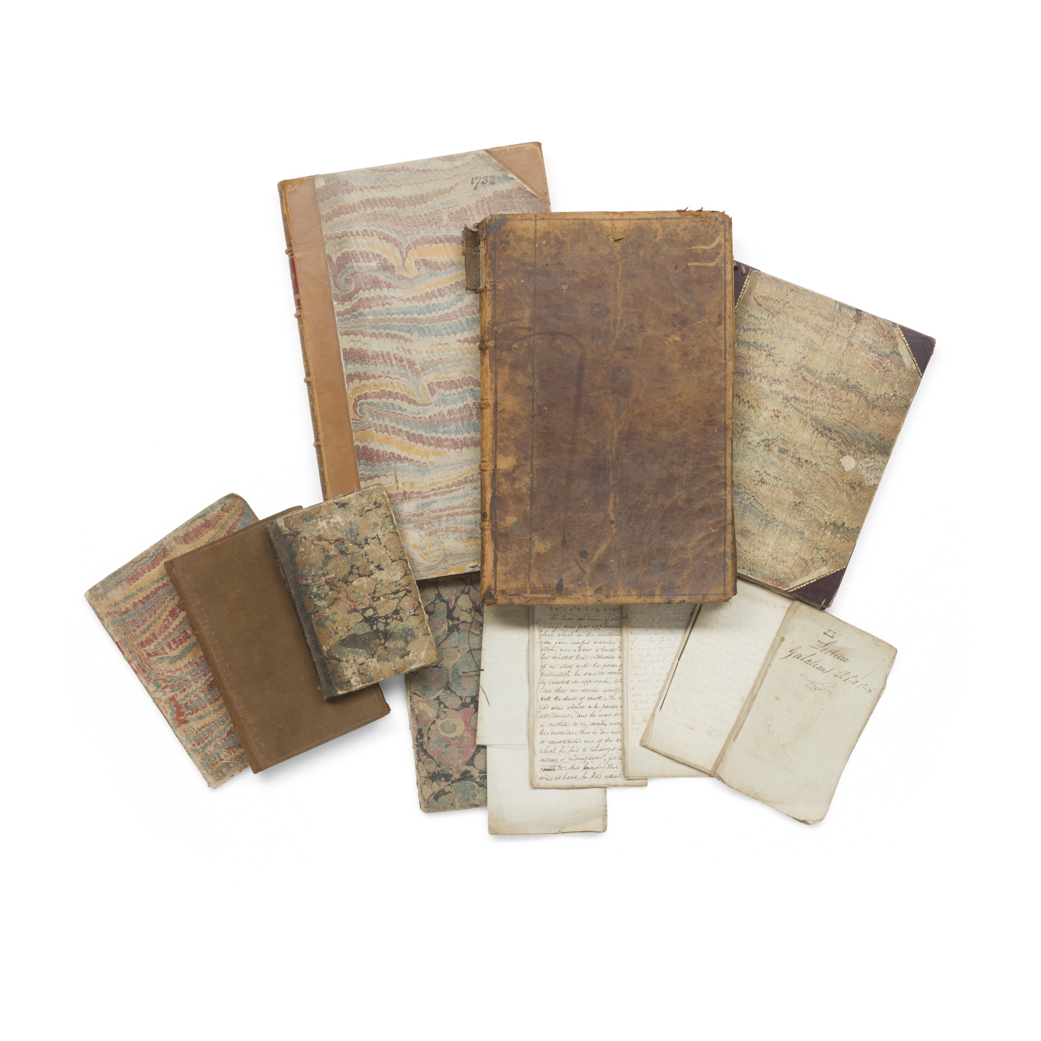 and 8 others, comprising: 'A Collection of Sentences, Moral, Divine etc. etc. for the benefit off [sic] and extracted by me, And[re]w Adamson, Vol. Ist, Cliftonhall, 1777' (12mo, contemporary sheep-backed marbled boards, 121 pp.); 'M. S. Accounts of Selkirkshire' [spine-title], c.1850 (folio, contemporary half calf, 50 ff., bookplate of Lord Napier); 5 Bible commentaries and similar religious writings, early 19th century (all stitched only); commonplace book, c.1825, including Byron's 'Ode to Napoleon Buonaparte' (contemporary marbled wrappers, separating along spine) (12)