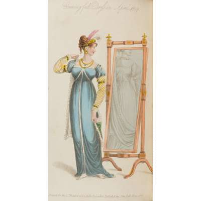 or, Bell's Court and Fashionable Magazine, addressed particularly to the Ladies. London: J. Bell, 1806-11. 11 volumes in 12, 8vo (23.2 x 14.5cm), contemporary red half morocco, 11 wood-engraved title-pages, 77 engraved hand-coloured costume plates, 212 further engraved plates (mainly portraits or needlework specimens, many folding), 22 plates of engraved music, bindings rubbed, loss to base of a few spines, lacking at least the plan of Jena in volume 1 part 1 and the wood-engraved title-page to volume 11, variable damp-staining (mainly to engraved portraits), a few stains and tears, a few plates with stab-holes visible in margins, volume 1 part 1 with marginal tear to May frontispiece, volume 3 coloured plate facing p. 161 with closed tear, quire G loose, volume 5 plate facing p. 10 with hole, facing p. 240 with short tear, volume 7 with tears to the two plates facing p. 192, volume 8 colour plate facing p. 120 with extensive closed transverse tear, volume 9 January frontispiece loose and torn, pp. 43-5 loose, volume 11 sig. F2 and attached plate loose, volume 12 plates facing pp. 47 and 56 with tears, sold as a periodical, not subject to return (12)