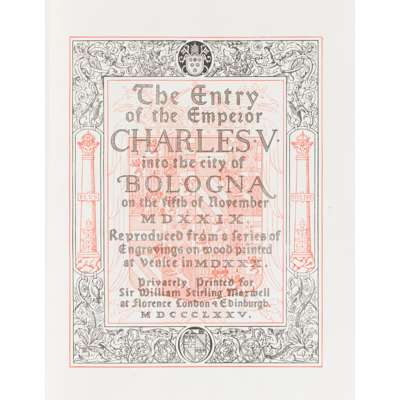 On the Fifth of November MDXXIX. Reproduced from a Series of Engravings on Wood printed at Venice in MDXXX. Florence, London & Edinburgh: privately printed for Sir William Stirling Maxwell, 1875. Large folio, decorative half-title and title-page printed in red and black, 16 double-page plates, original quarter morocco, yellow paper boards with bevelled edge, binding rubbed and marked, spotting to half-title and final plate
