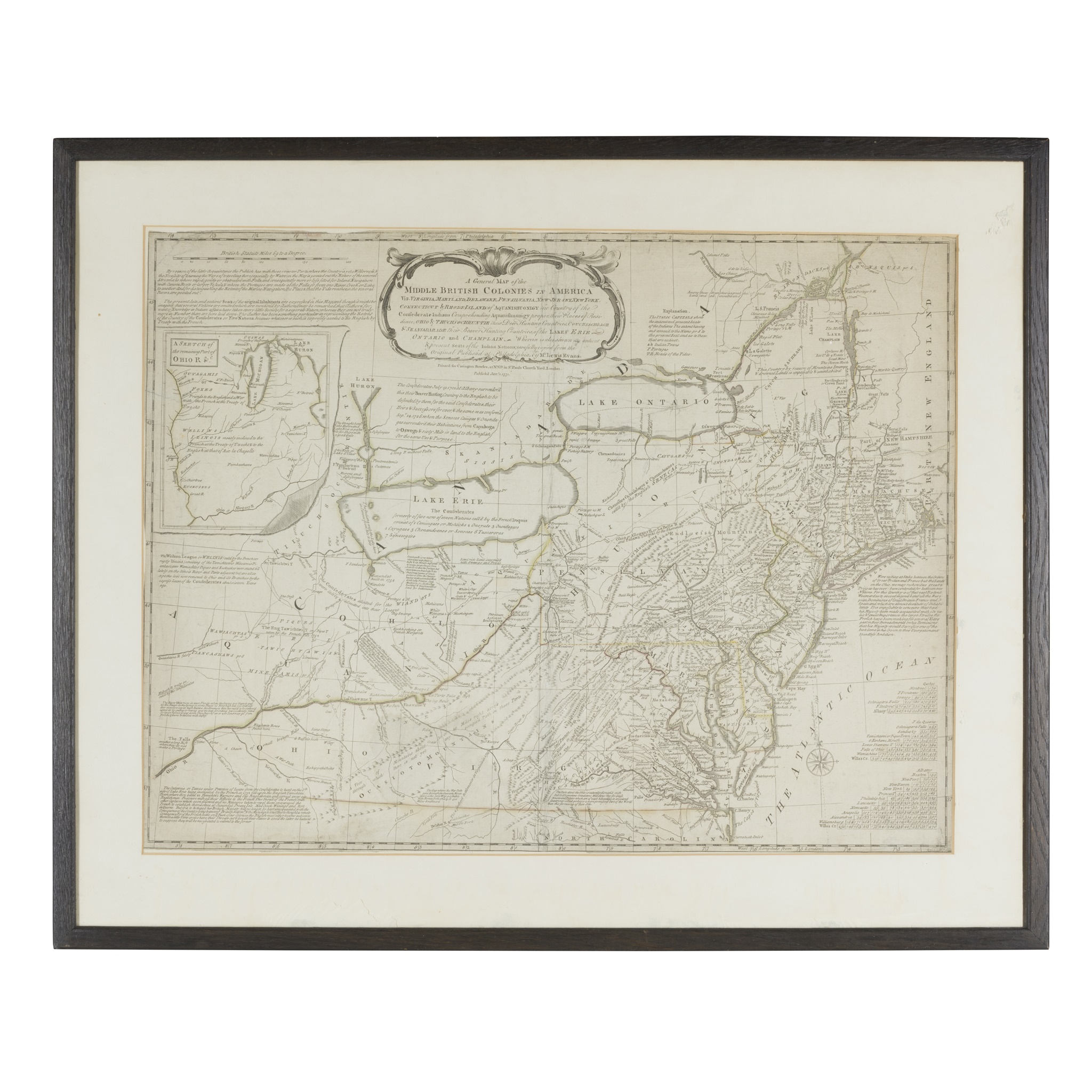 viz. Virginia, Maryland, Delaware, Pensilvania, New-Jersey, New York, Connecticut and Rhode Island: of Aquanishuonigy the Country of the Confederate Indians ... Wherein is also shewn the Antient and Present Seats of the Indian Nations; carefully copied from the Original published at Philadelphia. London: for Carington Bowles, 1771. Engraved map, hand-coloured in outline, title within decorative cartouche, inset map of the Ohio River, mounted, framed and glazed, mount aperture 50 x 65cm, trimmed slightly unevenly along neatline, old creasing along central fold, closed tears extending into frame from left-hand edge and within image to lower right of cartouche (affecting area of Lake Ontario), not examined out of frame