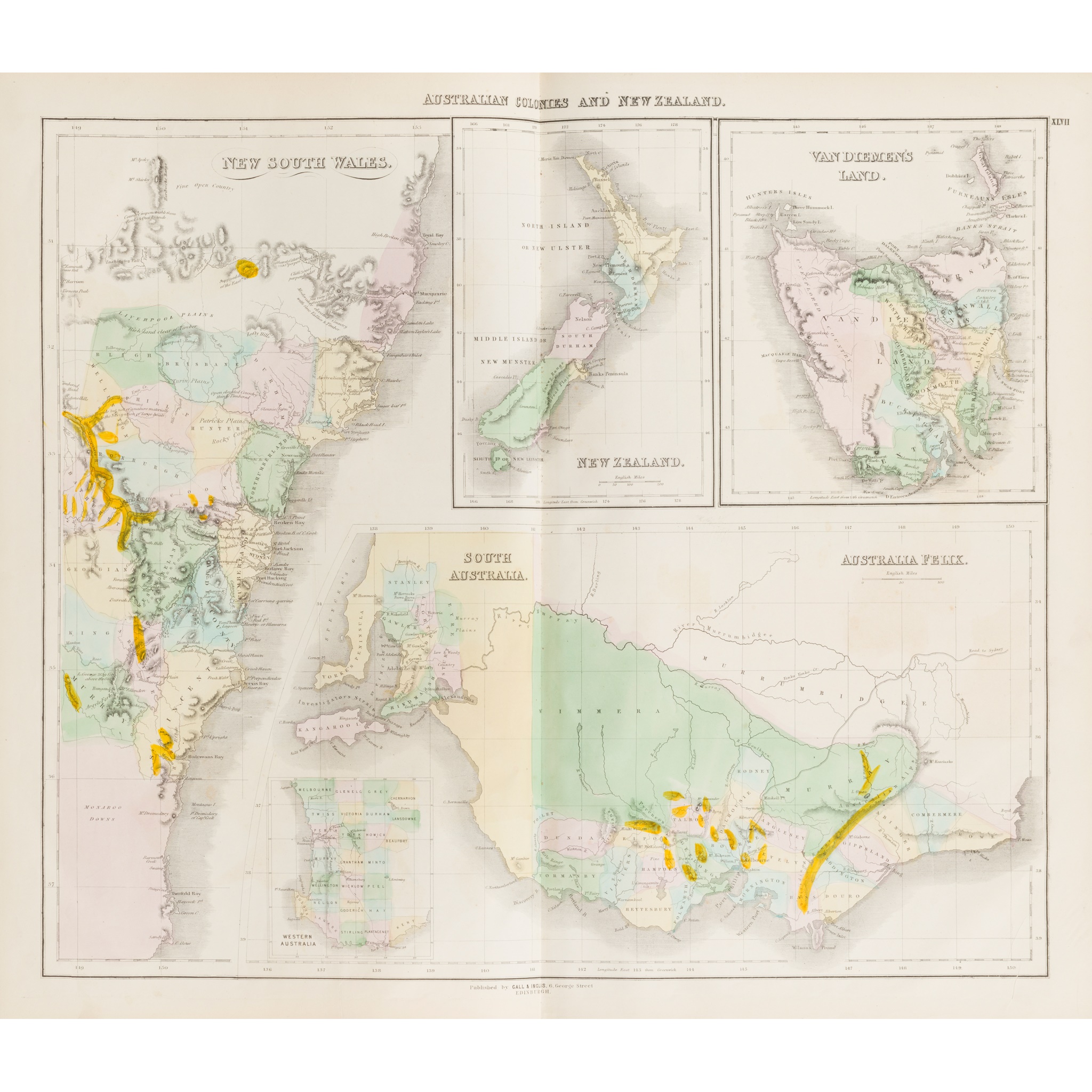 Note: The maps include Arabia, Persia, 'Hindostan', China and Japan, Canada and British North America, Islands of the Pacific Ocean, United States, and Australian Colonies and New Zealand.