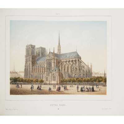 Grand album représentant les vues et les monuments les plus curieux de Paris et les sites les plus remarquables des environs. Paris, Martinet, c.1860. Oblong folio, original red cloth, tinted lithographic title-page, 24 tinted lithographic plates all with additional hand-colouring, erratically numbered (from 1 to 69), all but one by Charles Rivière, contemporary ownership inscription dated 1864 to front pastedown, wear to binding, a few tissue-guards torn, one plate ('Salle à manger du grand hôtel) with tissue-guard adhesion [cf. Bobins, The Exotic and the Beautiful, 949], together with a 19th-century scrap album, c.1856-7, containing original watercolours and pencil sketches (e.g. 'chien couchant', 'Hornsey church, Middlesex', 'A mill near Vauxhall Bridge, June 16th 1833', 'Highgate church from Hampstead Heath, 1833'), loose and mounted, transcribed poems, and prints (2)