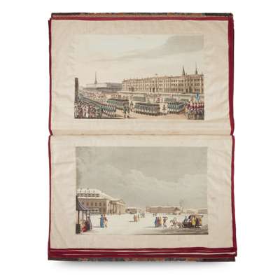[A Picture of St. Petersburg, represented in a Collection of Twenty Interesting Views of the City....] [London: Edward Orme, 1815], 20 hand-coloured aquatint plates after Mornay, (image size 340 x 240mm), no text or title page, plates carefully trimmed to edge of image, mounted on beige ?silk with red cotton edges, in an album with other mounted chromolithographs from the Illustrated London News, half morocco, rubbed