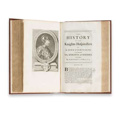 London: for G. Strahan [and others], 1728. First edition in English, 2 volumes, folio (34.1 x 22cm), modern leatherette, [8] 487 [1] 180, [2] 80 79-220 143 [1] 196 [24] 3 [1] pp., 71 engraved portrait plates, 5 maps and plans (all but one folding), title-pages dust-soiled, occasional marginal finger-soiling, a few other marks, plates 11 and 47 and unnumbered plate facing volume 2 p. 108 browned, plate 48 stained, map of Malta and Gozo in volume 2 with partial split along one fold, volume 1 leaves 3D1 and 5K1 with repaired closed tears extending into text, short repaired tears to lower margins of a few other leaves (e.g. 3E1, 3L1, 4H1-2, 5S2, 5Z1), marginal loss and attempted repaired to 5Z2, volume 2 2O2 with loss to lower margin, 2M2, 3H1 and *T1 each with closed tear extending into text, 3K2 extensively repaired [ESTC T53873; cf. Cobham-Jeffery p. 62] (2)