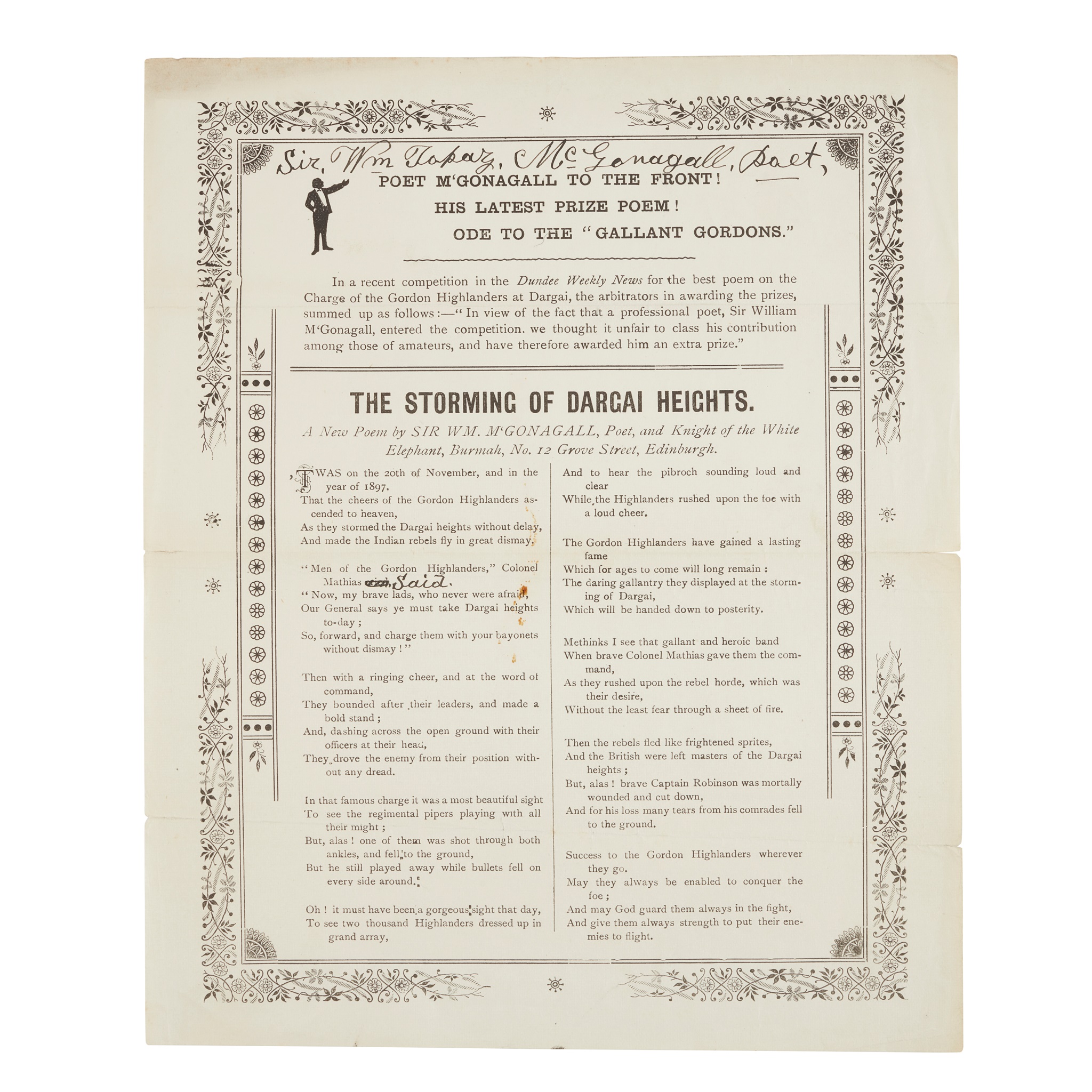 Note: Very rare broadside by the infamously bad Scottish poet, no other copies traced in libraries or in commerce. The storming of the Dargai heights was a noted action in the 1897 Tirah campaign on India's north-west frontier, led by the Gordon Highlanders.