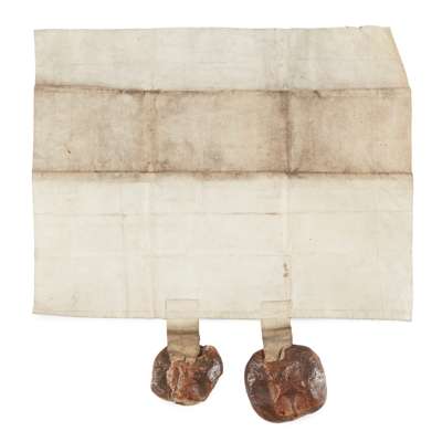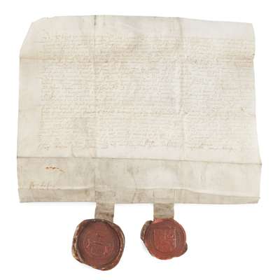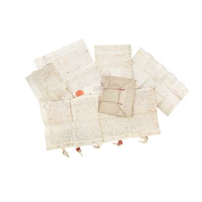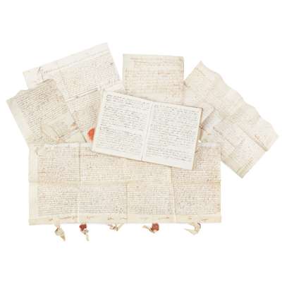 deed on vellum (25 x 31.5cm), recording an agreement between 'James Erle of Arrane' and 'our derest brother Johnne Lord Hamiltonn', relating to a vicarage, mentioning inter alia 'the vicarage of Kilmorie in Arrane', signed at foot 'James' and 'J Hamilton', red wax seals of both attached, John, Lord Hamilton's seal with chips to edges and hairline crack. Together with 11 other deeds and indentures on vellum or paper, including a 17th-century deed in Latin signed by William, Earl of Glencairn. And an 18th-century memorandum book