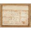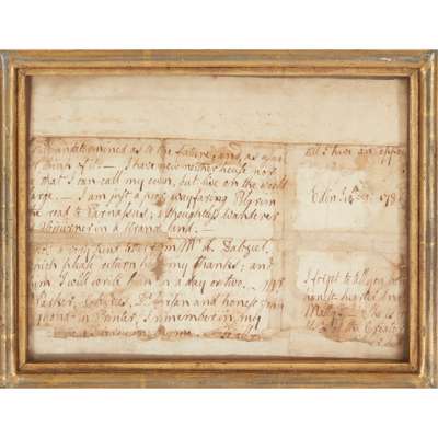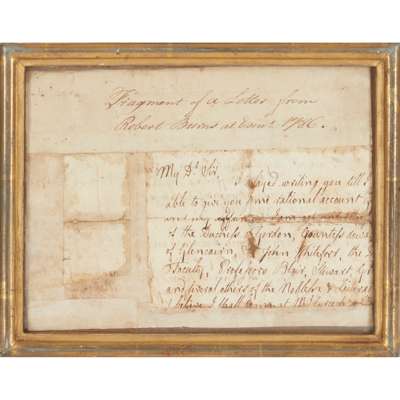 On laid paper, with extensive early repairs and marginal extensions, concomitant soiling and staining, holes along longitudinal central fold, annotated 'Fragment of a letter from Robert Burns at Edinr 1786' on section of paper watermarked [1]797, glazed both sides and framed, part of some letters and words cropped