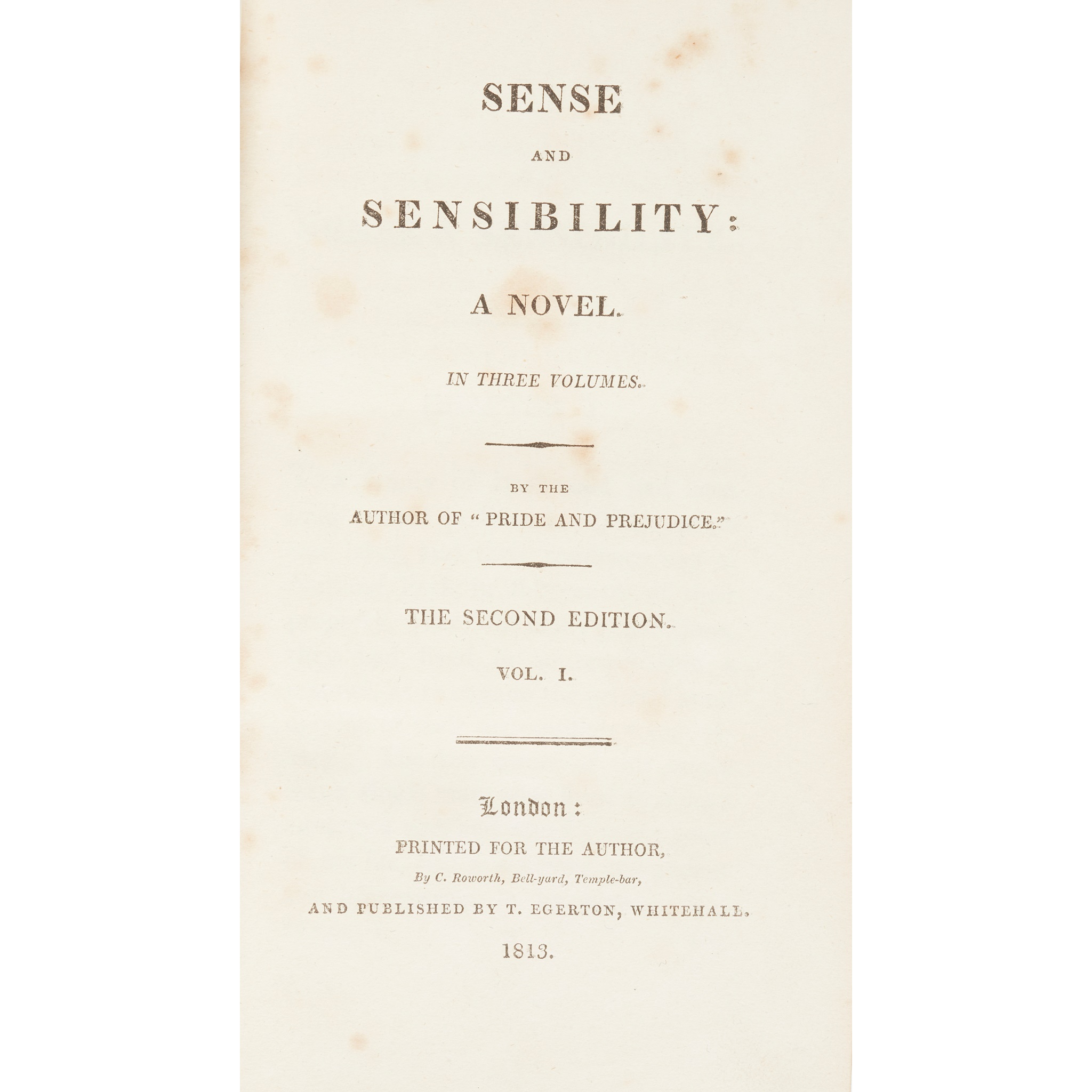 A Novel. In Three Volumes. By the Author of "Pride and Prejudice". London: printed for the author, and published by T. Egerton, 1813. 3 volumes, 12mo (17.5 x 10cm), mid-late 19th century tan half calf, green morocco title labels to second compartments, volume numbers gilt to fourth compartments direct, comb-marbled sides, edges sprinkled red, with the half-titles, without the final blanks (O10, N8, O4), moderate spotting to outer leaves, occasional lighter spotting elsewhere, bindings rubbed, [Gilson A2; Keynes 2]
