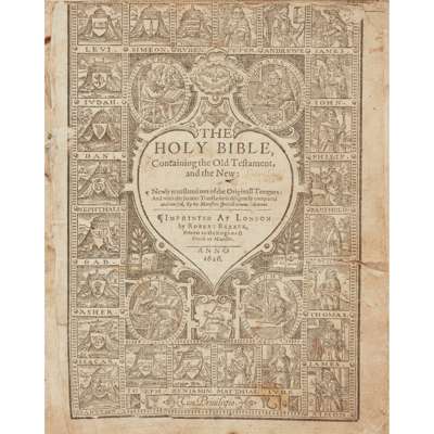 London: Robert Barker, 1616. Large 8vo, General title and New Testament title within woodcut border, eighteenth century panelled calf, with blank leaves A8, &&8 and 3N2, some running titles trimmed by the binder, General title torn and slightly worn at top edge, D3 small hole affecting a few letters, NN3 corner torn away with loss of a few letters, ZZ5 with slight loss of blank lower margin, some dampstaining and slight dust-soiling; bound with The CL Psalmes of David in Scottish metre. Edinburgh: Andro Hart, 1615. 4to, lacking OO1-2, OO4 frayed with loss of a few letters, worn