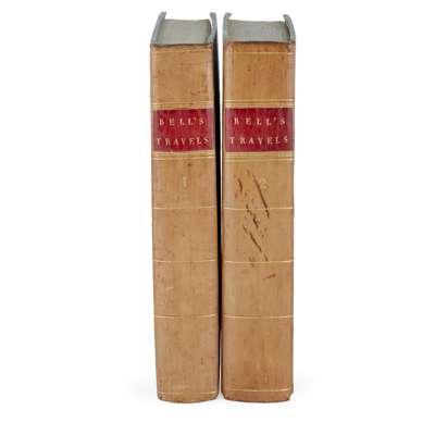 Containing a Journey to Ispahan ... Part of a Journey to Pekin in China, through Siberia ... The Continuation of the Journey between Mosco and Pekin ... A Journey from Mosco to Derbent in Persia ... A Journey from St. Petersburg to Constantinople. Glasgow: for the author by Robert and Andrew Foulis, 1763. First edition, 2 volumes, 4to (23.5 x 17.5cm), contemporary tan quarter calf, red morocco labels, marbled sides, vellum tips, engraved folding map, advertisement leaf to rear of volume 1, errata leaf to rear of volume 2 [Cross, In the Lands of the Romanovs B23; ESTC T99651; Gaskell 415)