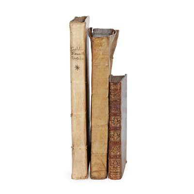 Panvinio, Onofrio. Epitome pontificum Romanorum a S. Petro usque ad Paulum IIII. Venice: impensis Jacobi Stradae Mantuani, 1557. First edition, folio in sixes (29.5 x 20cm), contemporary limp vellum, [8] 428 [16] pp., large strapwork woodcut device to title-page, woodcut illustrations of papal arms throughout the text, contemporary ownership inscription to title-page (apparently belonging to a count, 'Comes'), ties perished, damp-staining from front to quire G and to index [Adams P194];
