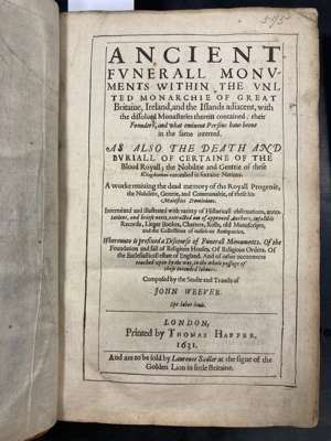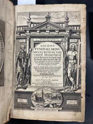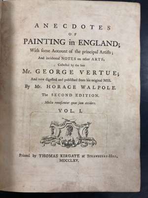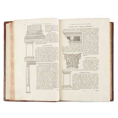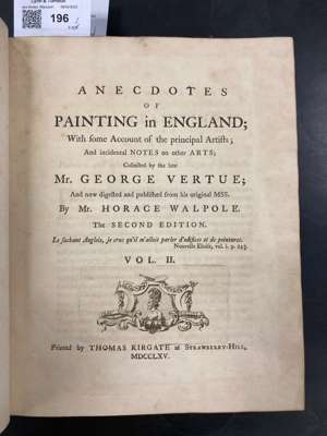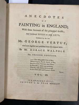 Cum notis ... Guilielmi Philandri ... Danielis Barbari ... Claudii Salmasii ... Praemittuntur Elementa architecturae ... ab ... Henrico Wottono ... Accedunt Lexicon Vitruvianum Bernardini Baldi ... et Eiusdem Scamilli Impares Vitruviani. De pictura ... Leonis Bapistae de Albertis. De Sculptura ... Pomponii Gaurici ... Ludovici Demontiosii Commentarius de Sculptura et Pictura ... Omnia in unum collecta, digesta et illustrata a Joanne de Laet. Leiden: apud Ludovicum Elzevirium, 1649. Folio (30.9 x 19.5cm), contemporary English panelled calf, rebacked, [8] 30 [2] 252 [30] 253-272 164 69 [3] pp., engraved allegorical title-page, numerous woodcuts in the text, repairs to corners of boards, endpapers renewed, small faint stain to first few leaves [Cicognara 726; Willems 1097]. Together with 2 others (John Weever, Ancient Funerall Monuments, 1631, first edition, folio, contemporary calf, engraved frontispiece and additional architectonic title-page, woodcuts in text, several full-page, bound without index, frontispiece laid down, closed tear in A4, marginal repair to 2A3; and Horace Walpole, Anecdotes of Painting in England, Strawberry Hill Press, 1765, second edition, volume 1-3 of 4, volume 4 published later, in 1771, 4to, contemporary calf, engraved plates)