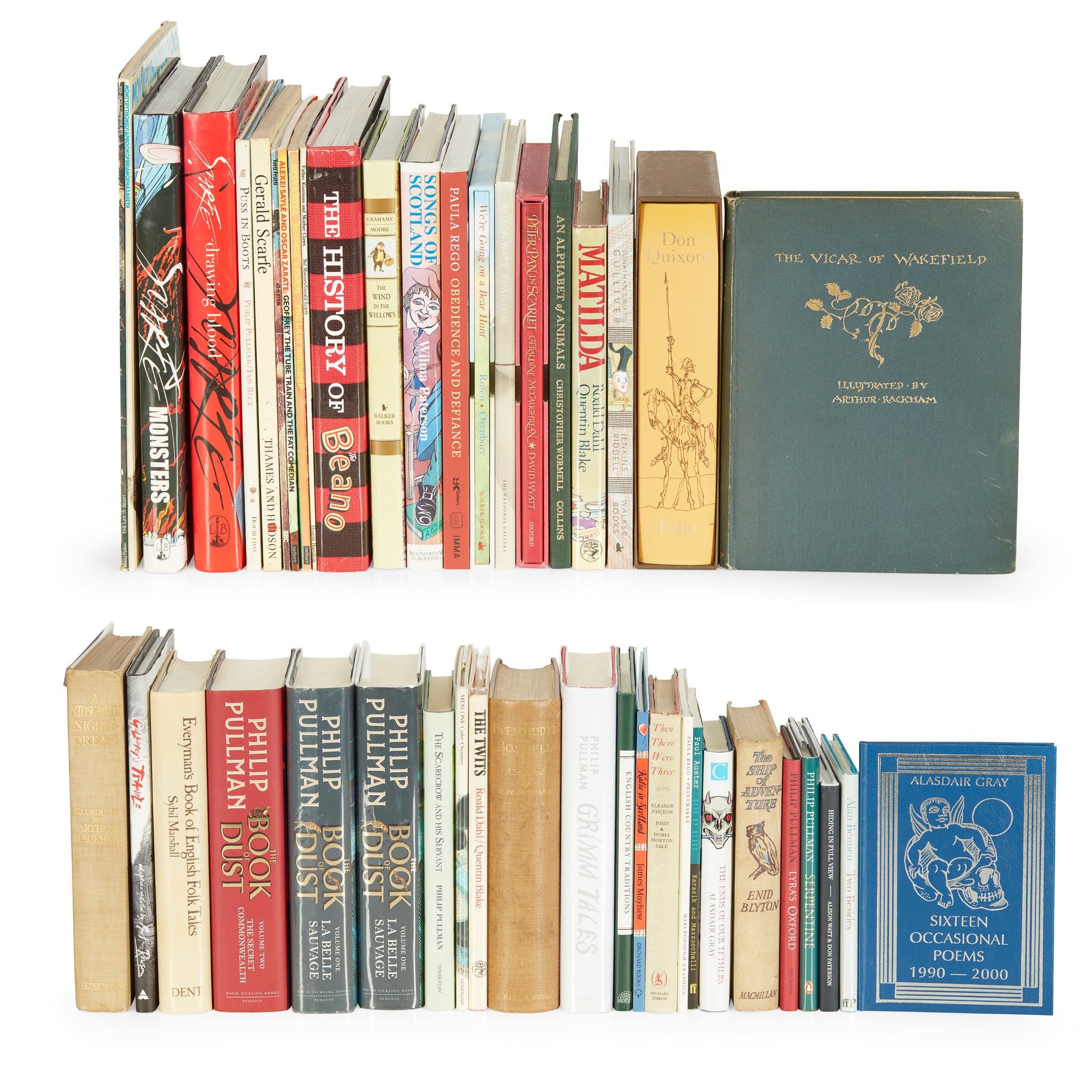 and approx. 30 others, including: Paul Coldwell, Paula Rego: Printmaker, 2005 (signed by Paula Rego) The History of the Beano, 2008 (large 4to, inscribed by Euan Kerr and Morris, editors of the Beano, with an original pencil sketch of Minnie the Minx by Jim Pence, and an original ink sketch of Gnasher); Alasdair Gray, Sixteen Occasional Poems 1990-2000, 2000 (one of 200 copies, signed); Arthur Rackham, The Vicar of Wakefield, 1929 (first trade edition, original cloth); idem, A Midsummer Night's Dream, 1911 (first trade impression, second impression); Inga Moore (illustrator), The Wind in the Willows, 2000 (signed); Michael Rosen, We're Going on a Bear Hunt, 2009 (20th anniversary edition, signed by Michael Rosen and illustrator Helen Oxenbury); Gerald Scarfe, Monsters: How George Bush Saved the World and Other Tall Stories, 2008 (signed), and Drawing Blood; Forty-Five Years of Scarfe Uncensored, 2005 (inscribed); and similar