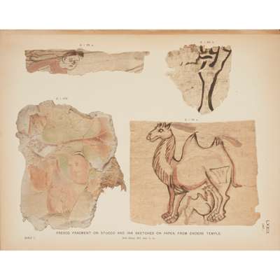 Detailed Report of Archaeological Explorations in Chinese Turkestan. Carried out and described under the Orders of H.M. Indian Government. Oxford: Clarendon Press, 1907. 2 volumes, 4to, recent half leather, pp. xxiv 621, vii, volume 1 containing 34 halftone photographic plates (images numbered 1-71), volume 2 with 118 plates (of 119: lacking plate 119, 'Judaeo-Persian document') including halftones and other media, many in colours, folding lithographic map in end-pocket, volume 1 text-leaves browned, edges slightly friable in places, a few concomitant chips, title-page with pen marks and effaced ink-stamp, leaf D1 loose, closed tears and repairs to plates 64-6, small worm-tracks appearing in text and lower margin from p. 500, volume 2 title-page chipped, crudely repaired in margin and with effaced ink-stamps, plates variably spotted and browned, with a few small worm-tracks up to plate 40, plates 107 with various chips, tears and repairs, folding map browned, friable and torn into sections