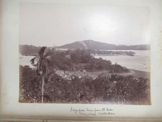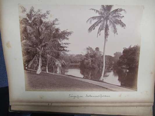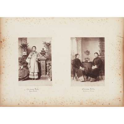 pasted onto both sides of card leaves, including 4 prints of Algiers, a view of Port Said, 4 views of the Suez Canal by Langaki, a Turkish lady by Langaki, 2 views of Singapore, 3 views of Hong Kong, 2 views of Foochow, 4 views of Shanghai, 2 smaller images of Chinese girls in costume, 3 smaller views of ships in Nagasaki Harbour, 2 views of Cochin [including scene of group working cocoa nut fibre], 21.5 x 27cm wide at largest, 14 x 9.5cm at smallest, heavy foxing to mounts, varying amounts of fading to images, contemporary black morocco album, worn, lacking backstrip
