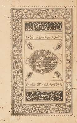 1) Ilahi Baksh Sha'iq. Gulzar-i manzum ['A Rose Garden of Poetry']. Kanpur: Matba' Nizami, 1294 AH [1877 CE]. 146 pp., floral borders throughout, original card wrappers printed in orange bound in, wear to foot of spine, marginal worming, text-block remaining attached to binding by one cord only;