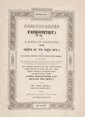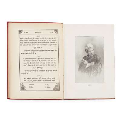 Allahabad: printed at the "Indian Press", 1894. First edition, 4to, original red cloth lettered and decorated in gilt, [2] 10 6 23 [1] 191 [1] 40 6 2 5 9 pp., text in Hindi within decorative pictorial border, title-page in Hindi and English with decorative floral border, 41 halftone plates from photographic portraits or Indian miniature paintings including portrait frontispiece, presentation plate from the author to Norwich Public Library to front pastedown, shelfmark in white ink to spine, spine faded, corners of boards bumped, withdrawal stamp to front free endpaper, title-page wit closed tear to head extending into border, and small section at lower inner corner detached but present
