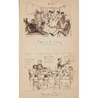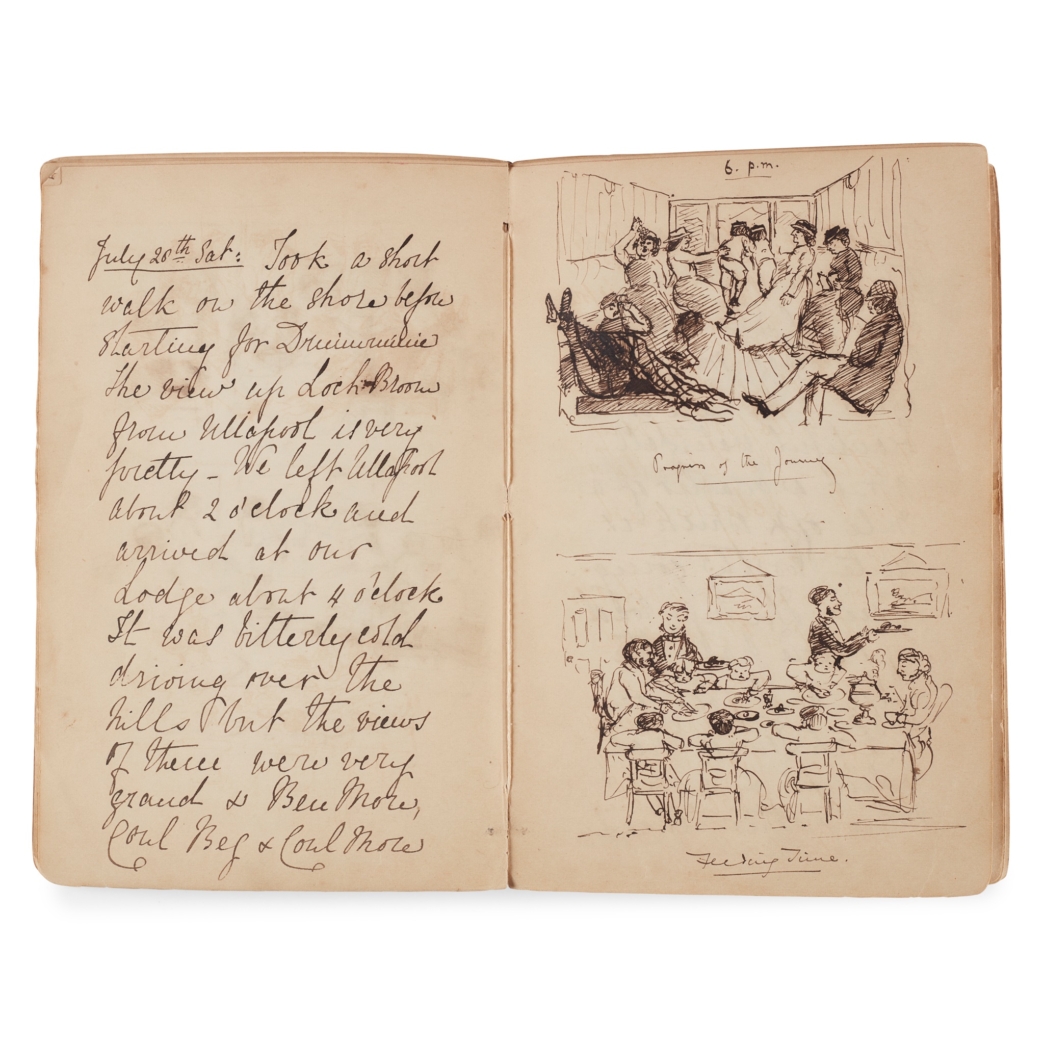 1) Sophia Leonora Clough Taylor. Journal in Scotland, 1866: beginning July 25th, detailing a journey heading up from York to the west coast of Scotland (Loch Broom) and a family holiday in the area, comprising 66 manuscript pages (including several amusing ink sketches), and several other small sketches laid-in, album 12 x 18cm;