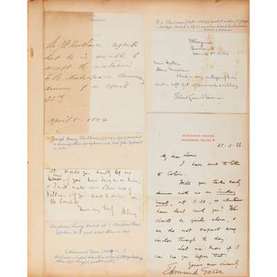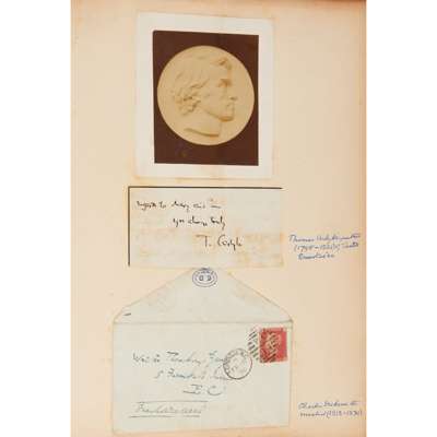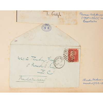 Clipped sentiments, fragments of letters, and other items, signed: Charles Dickens (autograph envelope addressed to George Walter Thornbury, biographer of J. M. W. Turner, 1870); John Ruskin; Andrew Lang; Florence Nightingale; Thomas Carlyle; Coventry Patmore; and similar.
