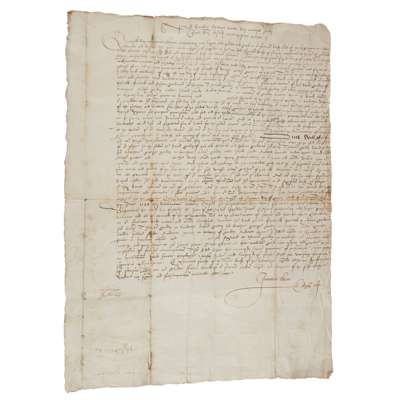 Charter signed by George Keith, 8th Earl Marischal (?-1694), royalist army officer, 1690, confirming John Thomson, merchant of Peterhead, and his wife Griselda Mylne in their possession of lands, in Latin, on vellum, 25 x 65cm;
