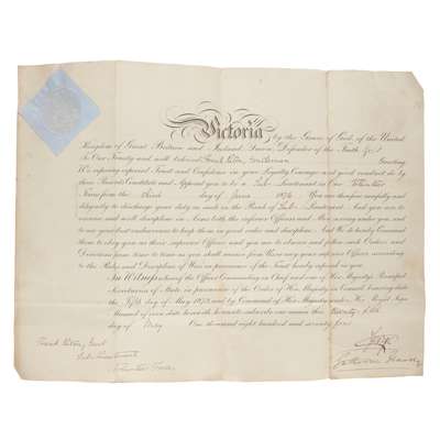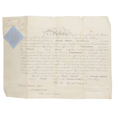 commissioning Frank Paton lieutenant in the 1st Forfarshire Rifle Corps, lithographic document on linen, 30 x 40cm, completed in manuscript, signed 'Victoria R' upper left, countersigned by Gathorne Gathorne-Hardy (later 1st Earl of Cranbrook) as secretary of state for war, wafer seal, folded, pin-holes to corners, recto with a few faint spots and marks, verso with spotting and soiling to panel outermost when folded. Together with Frank Paton's commission as sub-lieutenant in the same unit, 3rd June 1874, signed by Prince George, Duke of Cambridge (1819-1904) as commander-in-chief ('George'), countersigned by Gathorne-Hardy