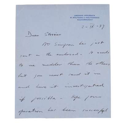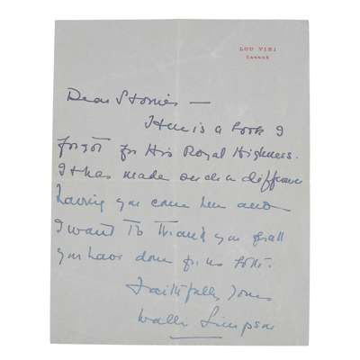 Simpson, Wallis. ALS addressed 'Dear Storrier', "It has made such a difference having you come here and I want to thank you for all you have done for us both. Faithfully yours / Wallis Simpson", 19 x 15cm;