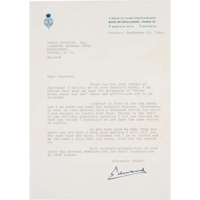 Edward, Duke of Windsor. TLS addressed 'Dear Storrier', thanking David Storrier for news, discussing health matters and writing, "With constant appreciation of your loyal and devoted services and Her Royal Highness and my best wishes, Sincerely Yours'. / Edward", dated 13th September 1966, 26 x 18.5cm