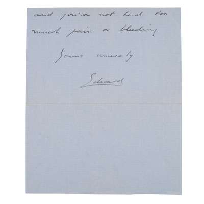 Edward, Duke of Windsor [King Edward VIII]. ALS addressed 'Dear Storrier', "Mrs Simpson has just sent me the enclosed. It reads to me madder than the others but you must send it in and have it investigated... Yours sincerely, Edward", dated 2nd April 1937, 21 x 17.5cm, with original unfranked envelope;