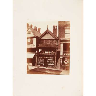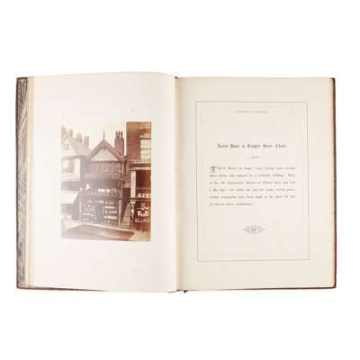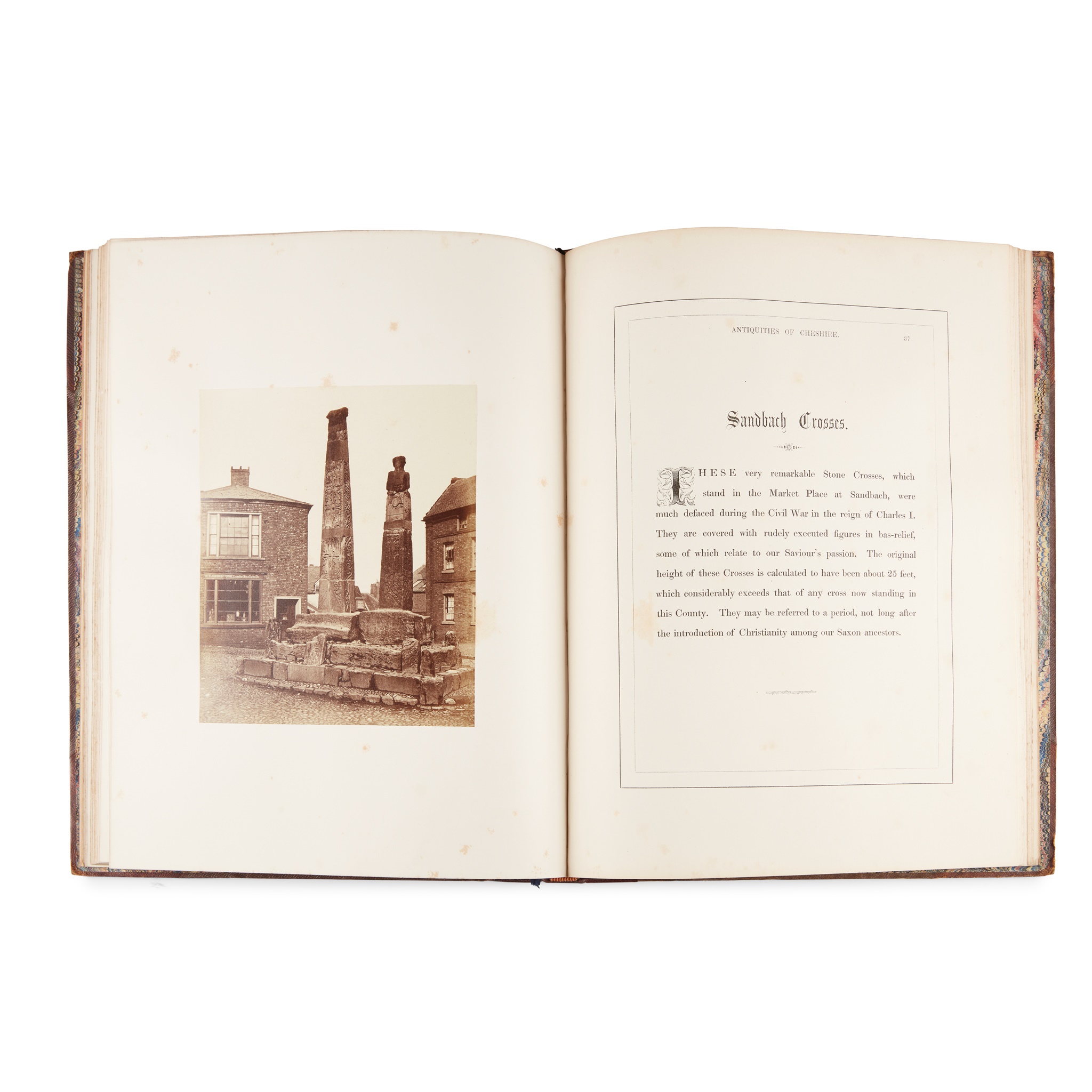 With Short Descriptive Notes: to which are added Views of Several Ancient Buildings in Shropshire and North Wales. Chesters: Hugh Roberts, 1858. First edition, 4to (37 x 27cm), original half morocco, rebacked, purple cloth sides, [9] 55 pp., 25 mounted albumen print photographs, some stripping and wear to backstrip and corners, variable spotting to mounts and text-leaves, silvering along edges of 'Birth-place of Bishop Wilson' (plate no. 8), very short closed tear to mount of 'Waberton Church' (no. 9), 'Tarvin Church' (no. 17) with a few spots within photograph, hint of silvering to 'South Doorway, Edstaston Church' (no. 25), withdrawn from Chester Reference Library with their plate to front pastedown, withdrawal stamp to initial blank, ink-stamp to title-page, and further small ink-stamps to pp. 3 and 55 [Gernsheim, Incunabula of British Photographic Literature, 83]. Together with: Charles Leigh, The Natural History of Lancashire, Cheshire, and the Peak, in Derbyshire. with an Account of the British, Phoenician, Armenian, Gr. and Rom. Antiquities in those Parts, Oxford: for the Author, 1700, first edition, folio, 20th-century half morocco, 24 engraved plates, folding map hand-coloured in outline, lacking portrait frontispiece, ex-Chester Reference Library with associated markings, damp-staining towards rear, text not collated