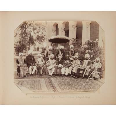 including 4 photographs of St. Petersburg, 5 of Aden, 12 of India, mostly by Burke (Kaibar Pass, 18th Bengal Lancers, 36th Sikhs, Delhi, Darjeeling), and c. 40 of France, 57 of Italy with captions in the negative; 53 of the U.K., 6 of Norway, 8 of the Alps, the photographs mainly loosely inserted at corners into album 'slits'; oblong folio, cloth, worn, 2 covers detached, one lacking spine, photographs from 21 x 29 cm. to 15 x 10cm; late 19th century