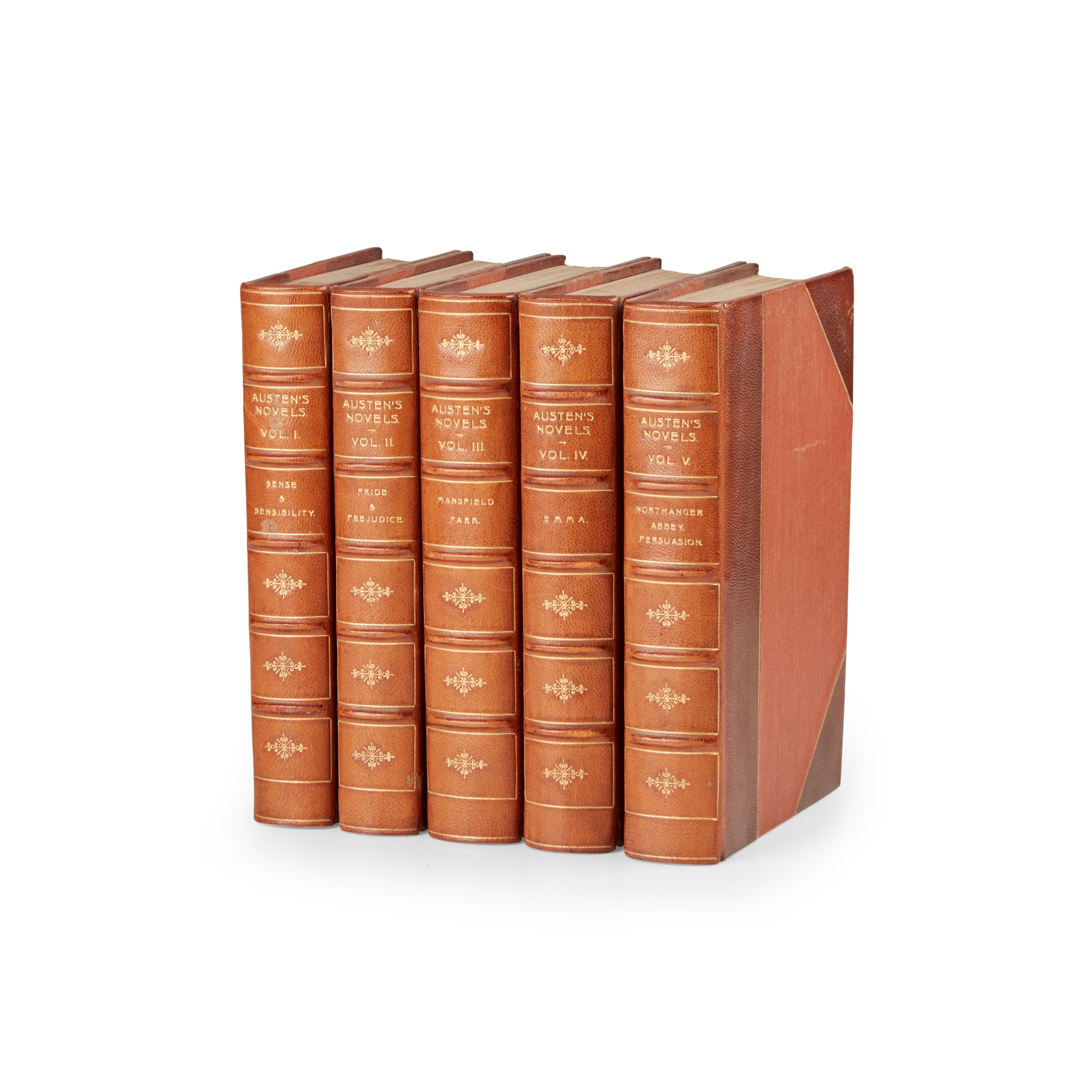 The Text based on Collation of the Early Editions by R. W. Chapman. With Notes, Indexes and Illustrations from Contemporary Sources. Oxford: Clarendon Press, 1926. 5 volumes, 8vo (19.2 x 13cm), contemporary half morocco by Ramage, spines gilt in compartments, top edges gilt, facsimiles of first-edition title-pages, 44 halftone plates mainly from Regency-era prints, spines sunned to tan, scuffs to spine of volume 1 and to raised bands of volume 4, a few pale markings to morocco
